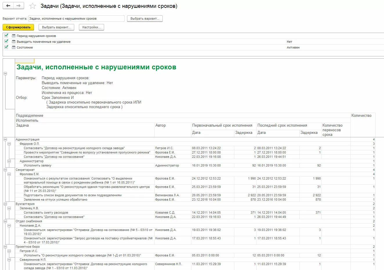 Отчет «Задачи, исполненные с нарушением сроков» покажет все просроченные задачи в разрезе сотрудников за обозначенный период.