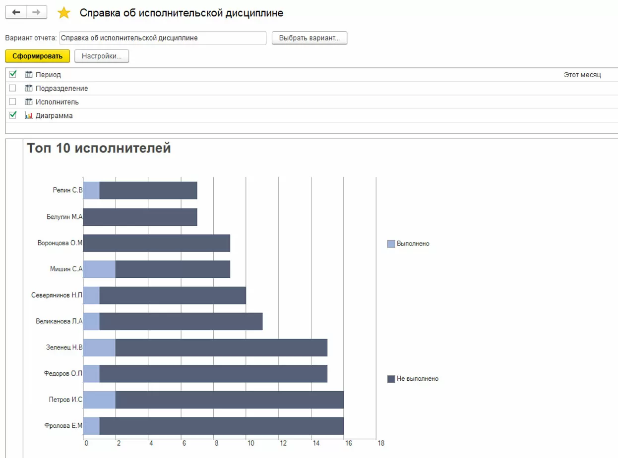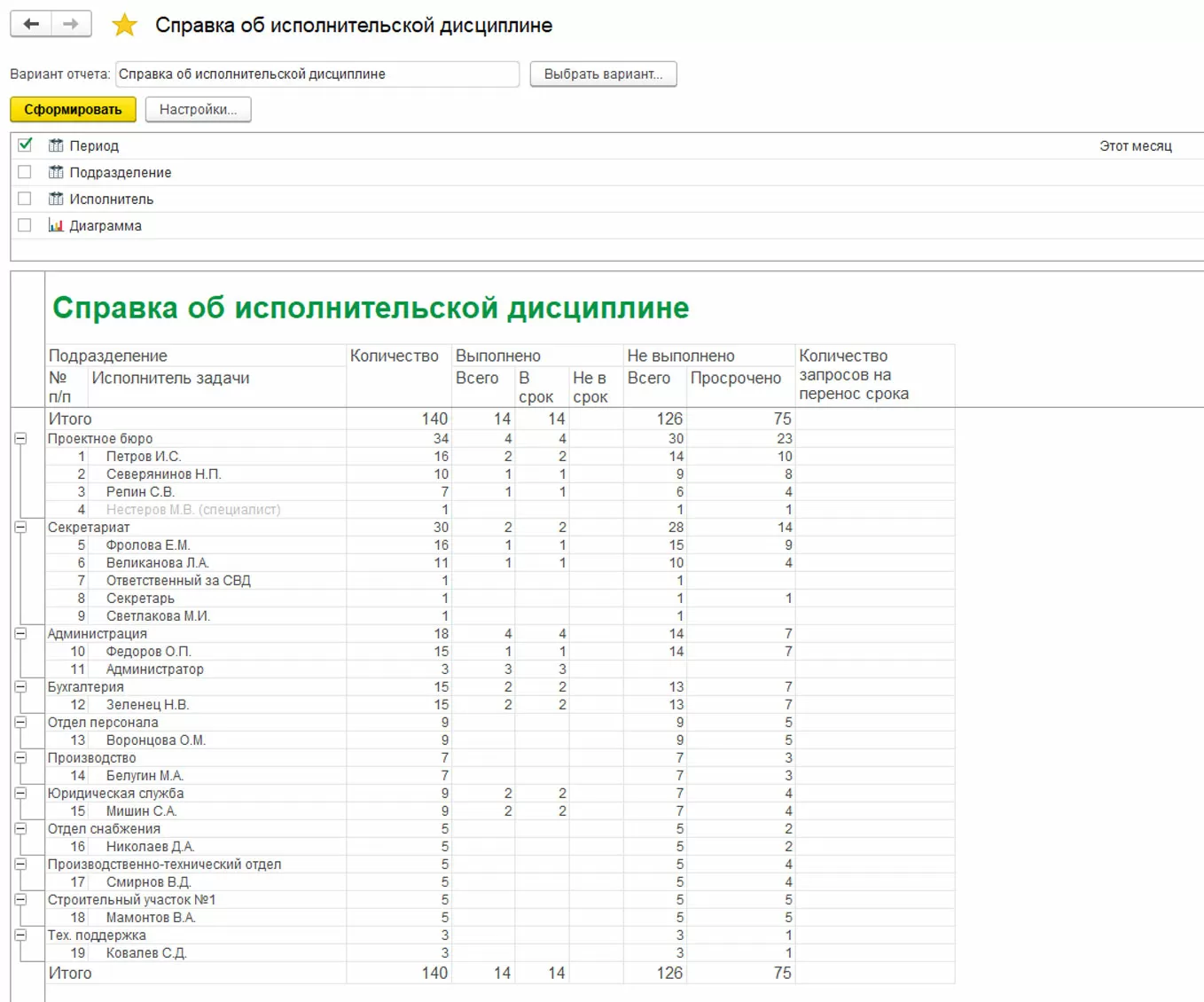 Здесь отображается общее количество задач, задач исполненных в срок, а также – с нарушением заданного срока (с возможностью сортировки по конкретным исполнителям или отделам), то есть оценить дисциплину в конкретных цифрах. Здесь же можно задать отбор по периоду, подразделению, исполнителю, а также отобразить эти же данные в виде диаграммы.