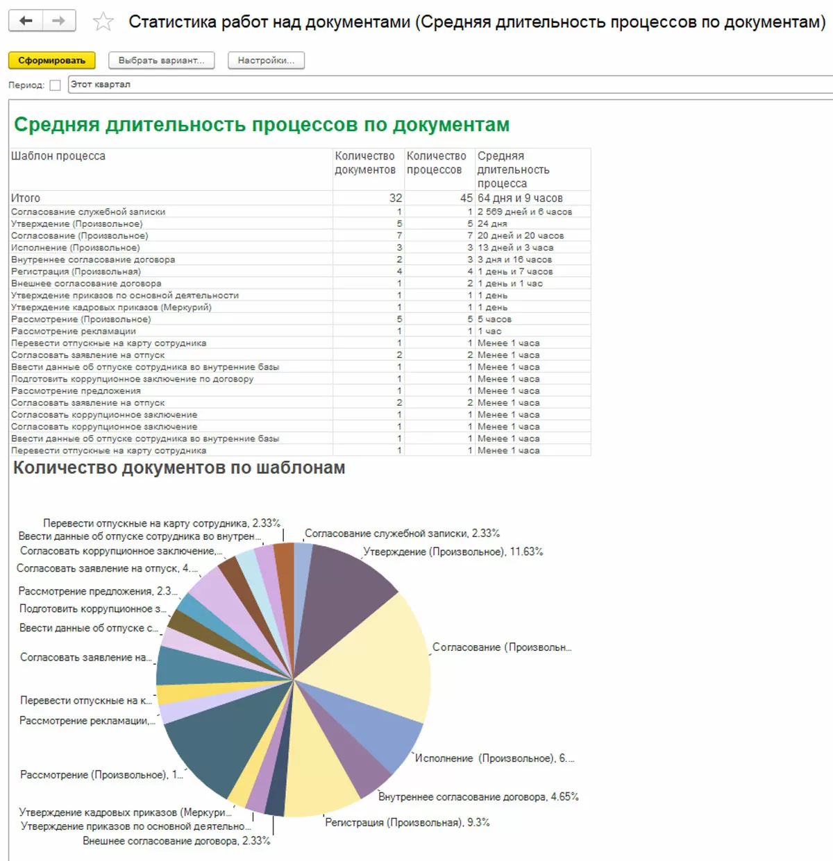 В 1С:Документооборот есть большой блок статистических отчетов, на основании которых можно провести анализ эффективности текущих бизнес-процессов, сделать соответствующие выводы и принять соответствующие управленческие решения.
