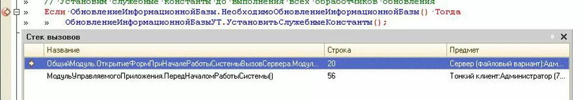 Иногда разработчикам необходимо узнать последовательность вызова процедур в алгоритме. Для этого им пригодится механизм стека вызовов из меню «Отладка». При его вызове открывается окно, в котором вы можете увидеть, из какой процедуры была вызвана та, где находится курсор отладки.