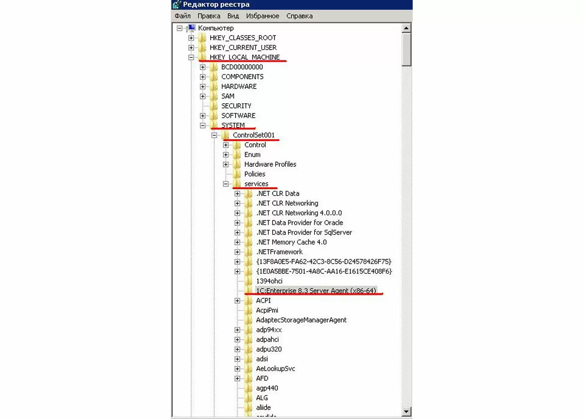 - В открывшемся окне в дереве слева пройдите по пути: «HKEY_LOCAL_MACHINE», «SYSTEM», «ControlSet001», «services», «1С:Enterprise 8.3 Server Agent»;
