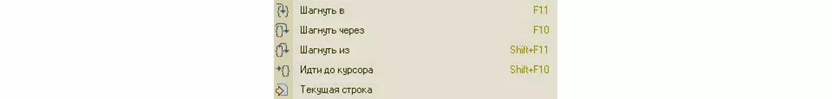 Еще один полезный механизм из этого меню – «Остановка по ошибке», позволяющий останавливаться только в недопустимых ситуациях. После остановки вы попадаете в конфигуратор и можете использовать другие возможности отладки. К примеру, перемещаться по строкам кода с помощью специальных клавиш, описанных в меню «Отладка», где сверху выведены более популярные функции. Разница между F10 и F11 заключается в том, что в первом случае вы будете попадать во вложенные функции и процедуры.