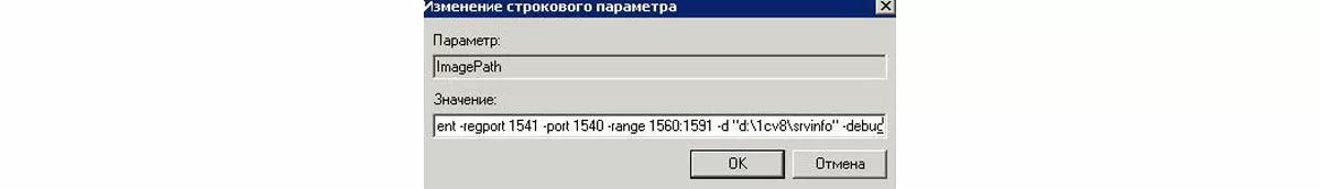 - Выделив нижний пункт, в правой части находим реквизит с именем «ImagePath» и меняем его с помощью контекстного меню. Чтобы подключить отладку на сервере, к существующему пути добавляем строку « -debug»;