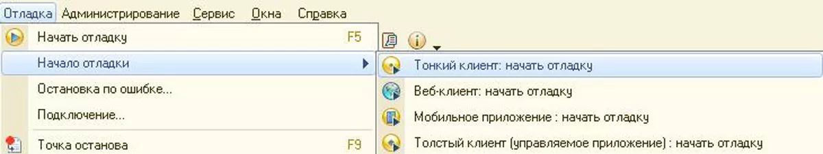 Чтобы запустить отладку через клиентское приложение, заходим в 1С в режиме конфигуратора и выбираем в меню «Отладка» нужный режим. Большинство современных конфигураций работают в режиме тонкого клиента, соответственно, и отлаживать работоспособность лучше в данном виде клиента. Если в вашей конфигурации используются различные виды клиентов, то для большего спокойствия протестировать функционал можно во всех режимах. В момент запуска режима отладки 1С открывает режим «Предприятие».
