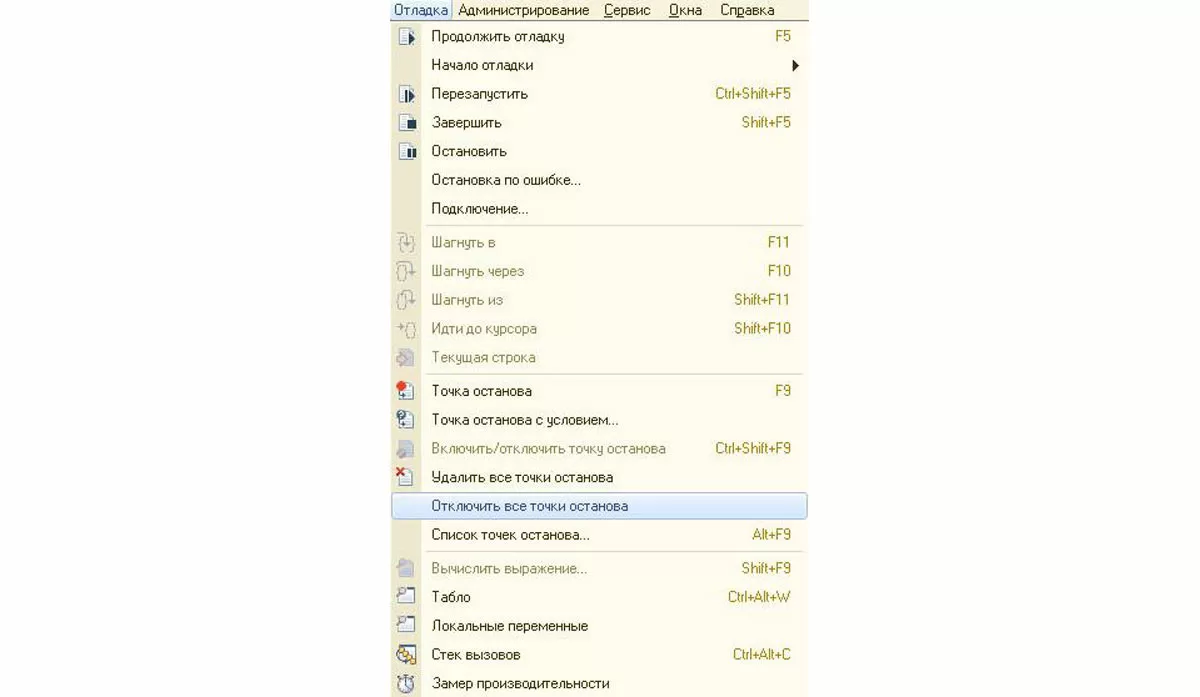 Чтобы увидеть установленные точки останова, воспользуйтесь меню «Отладка». Там вы сможете убрать все точки, отключить их, добавить новую и ознакомиться с «горячими» клавишами. Также в этом меню можно установить точку останова с условием (в виде синего круга). Она пригодится в ситуациях, когда вам нужно проверять код при выполнении условия, которое вам придется прописать при установке точки.