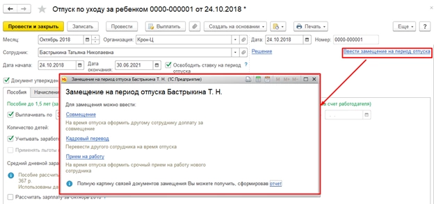 Для предприятий с большой текучкой персонала, особенно если большая часть персонала женщины, в ЗУП 3.1 КОРП реализован функционал для приема или перевода нового работника на время отсутствия основного работника (например, когда основной работник в декрете или на длительном больничном). Если на место отсутствующего работника будет принят новый работник по бессрочному трудовому договору, при возвращении на работу отсутствующего работника работодатель вынужден будет оплачивать работу обоих работников или сократить одного из них. В обоих случаях такая процедура для работодателя весьма затратна, т.к. ведет либо к увеличению фонда оплаты труда подразделения, либо к выплате пособия по сокращению работника.