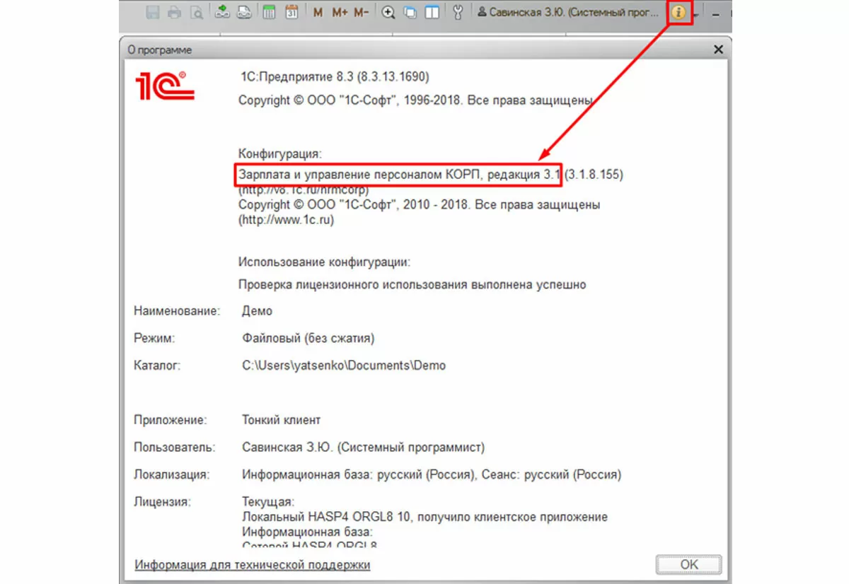 - Если Вы не знаете свою версию программы, то нажмите на значок помощи в верхней правой части экрана в виде латинской i, это откроет табличку, где будет указана версия программы.