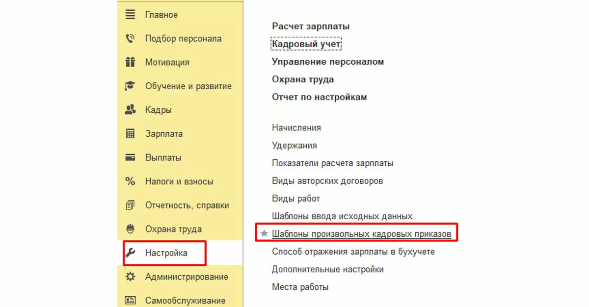 В ЗУП 3.1 КОРП появились произвольные кадровые приказы, которые сотрудники отдела кадров могут настроить и вести непосредственно в программе. «Шаблоны производственных кадровых приказов» настраиваются в разделе «Настройка».