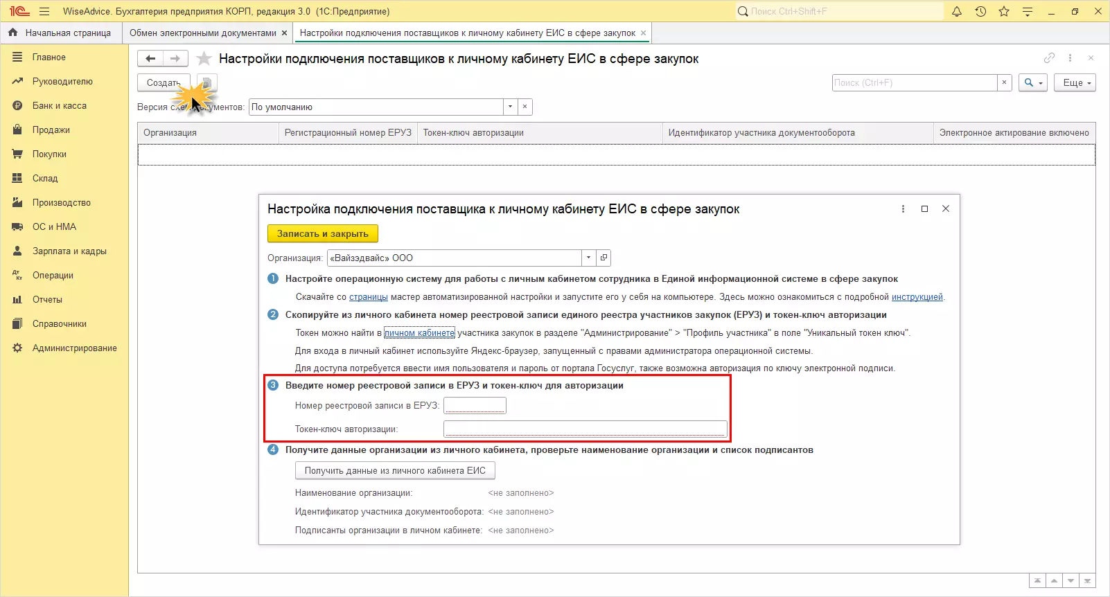 Пользователь самостоятельно может создать настройку подключения, указав номер реестровой записи в ЕРУЗ и токен-ключ авторизации.