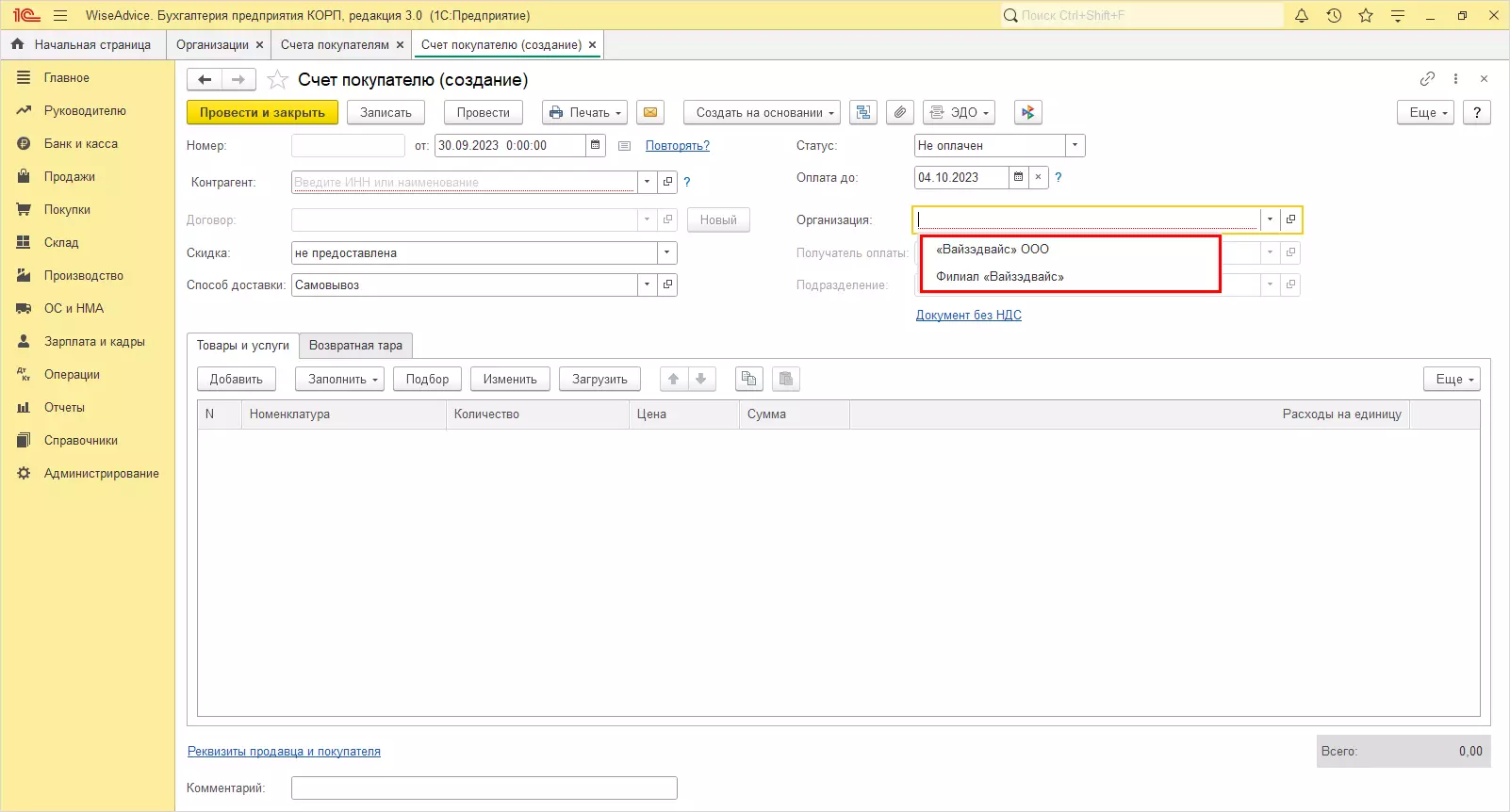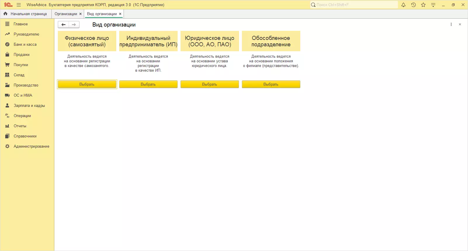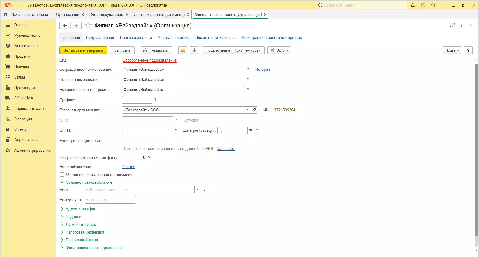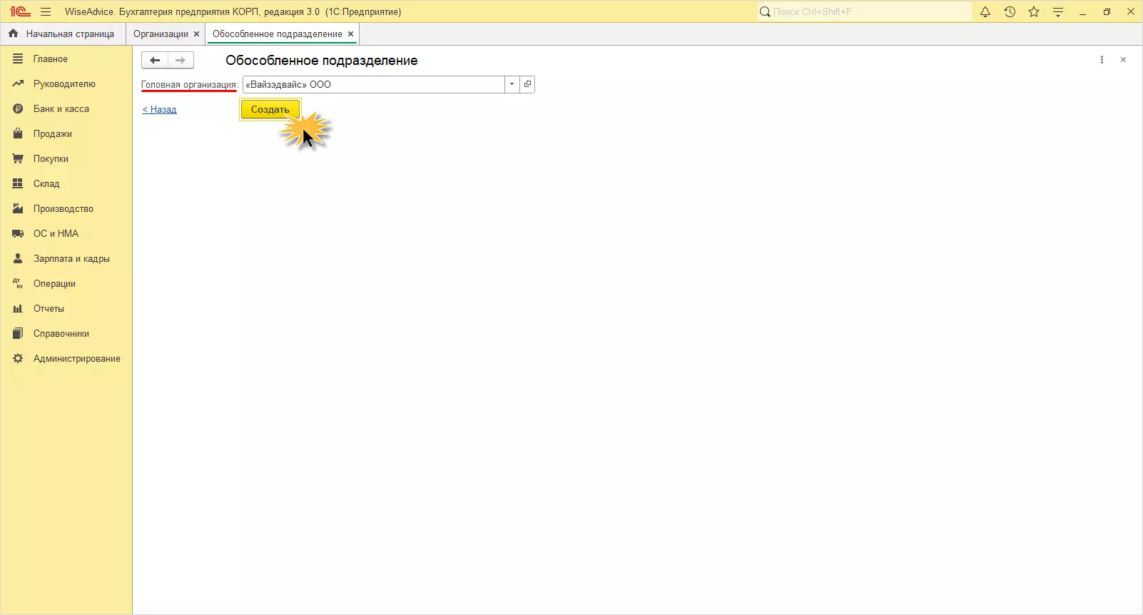 После установки нужных настроек программа дает возможность в справочнике «Организации» внести обособленное подразделение.