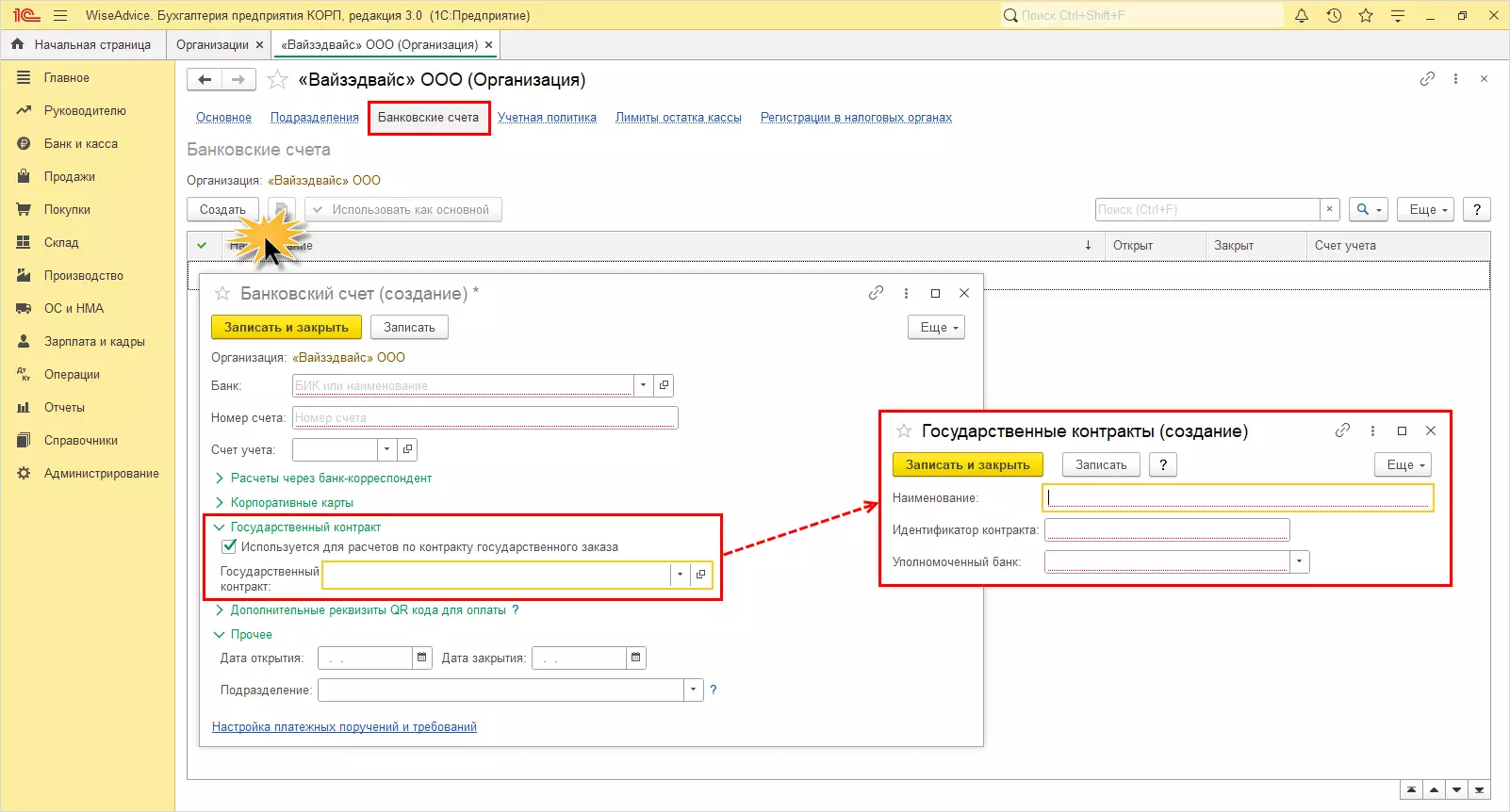 Конфигурация добавляет возможность внести отдельный расчетный счет для расчетов по госзаказу (раздел «Государственный контракт» в разделе «Банковские счета» организации) и вести учет госконтрактов, в одноименном справочнике.