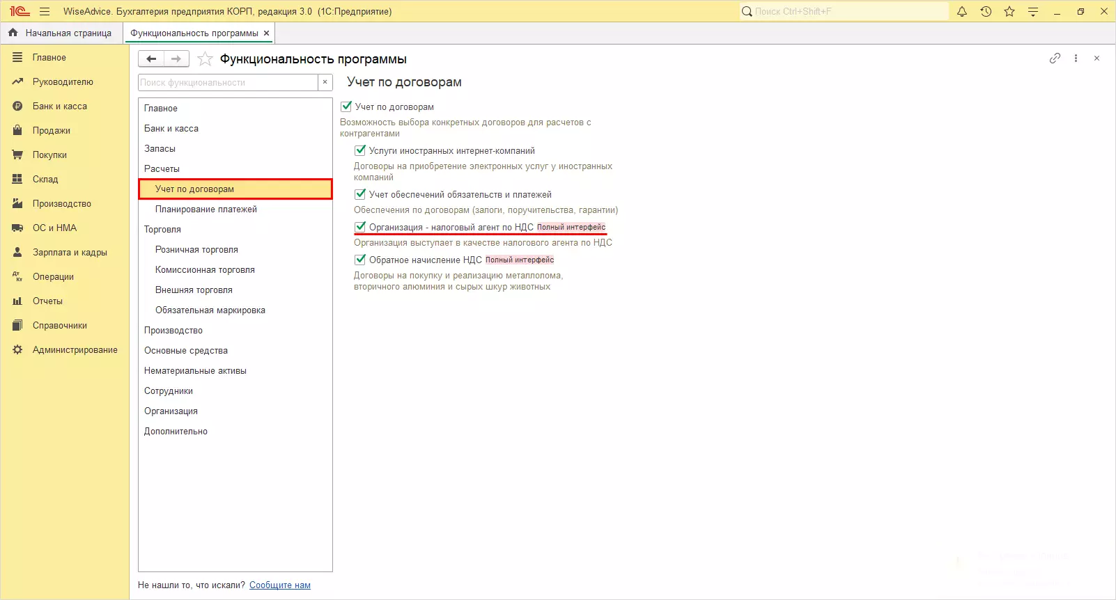 Функционал лом+шкуры позволяет вести автоматический учет НДС. Включается в блоке настроек «Учет по договорам» установкой галочки «Организация – налоговый агент по НДС».