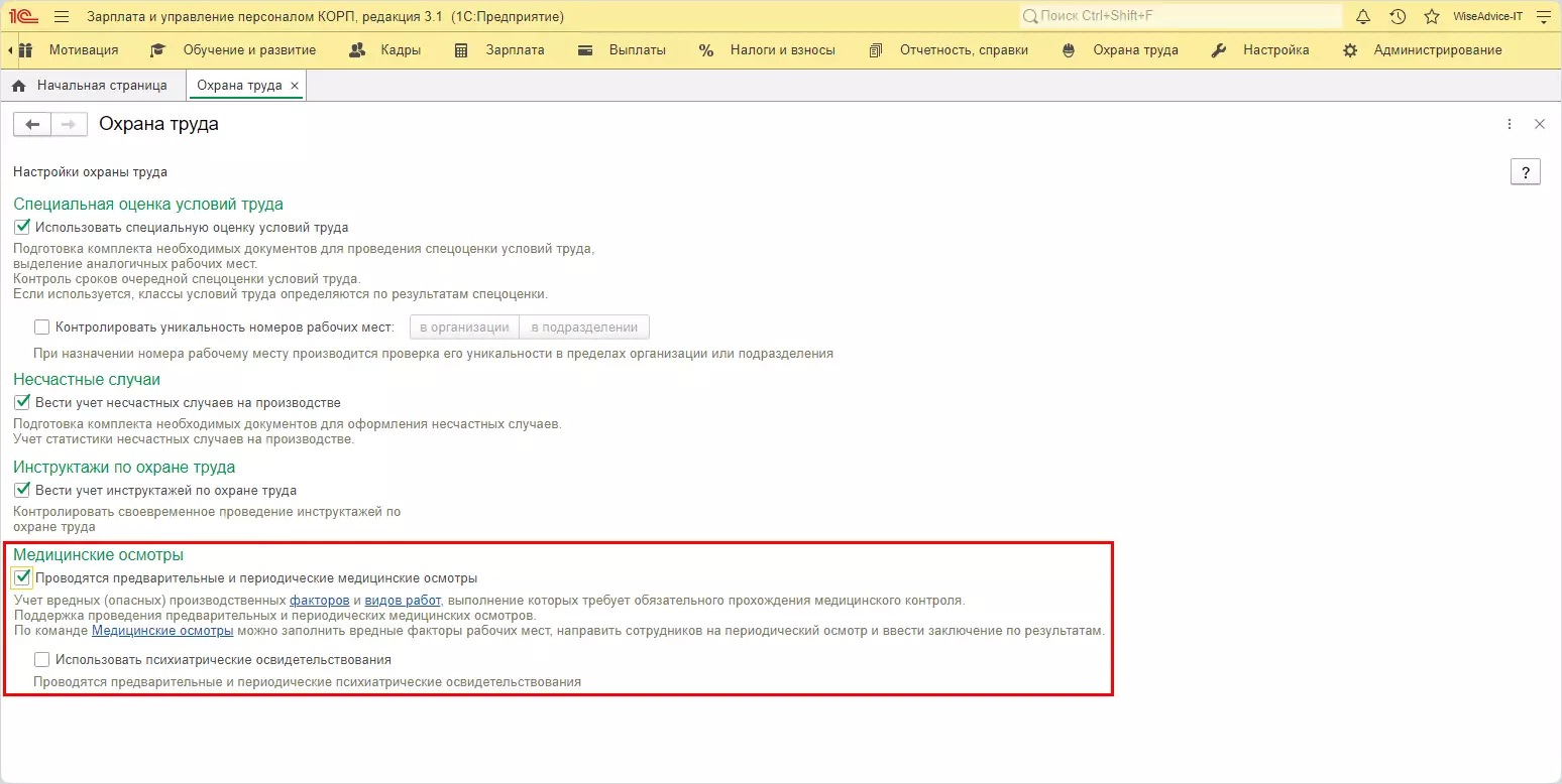 В разделе настроек Охрана труда в КОРП включается возможность проведения медосмотров.