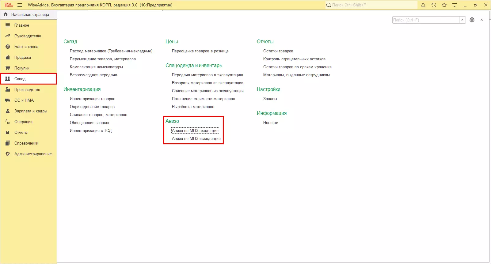 Если пройтись по разделам 1С:Бухгалетрия КОРП, то в некоторых вы увидите блок «Авизо». Например, раздел меню Склад - Авизо МПЗ взводящие и Авизо МПЗ исходящие.