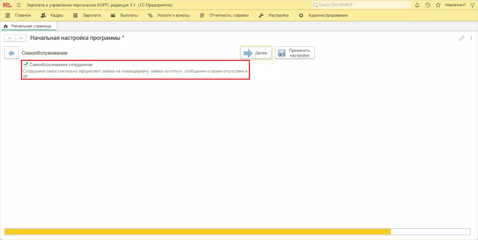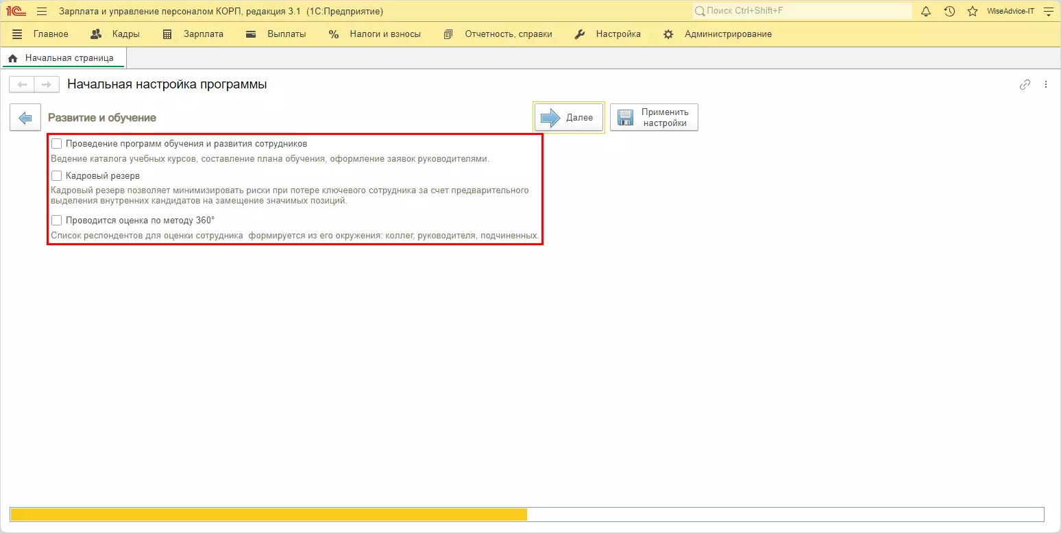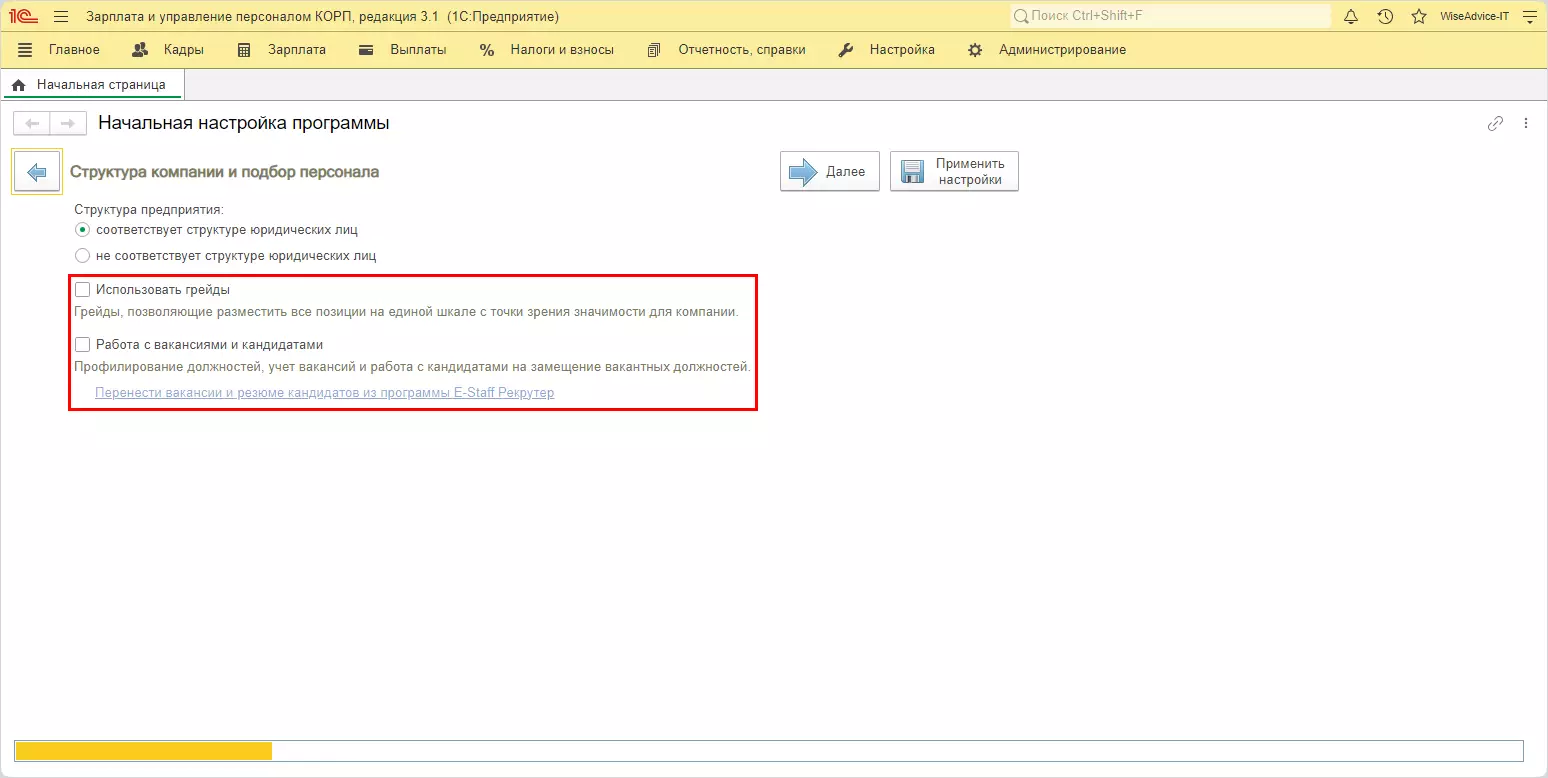 Отличия в версиях программы 1С:ЗУП видны, начиная с шага «Начальная настройка программы». Одним из ключевых преимуществ, отличающих версию КОРП от ПРОФ является HR-функционал.