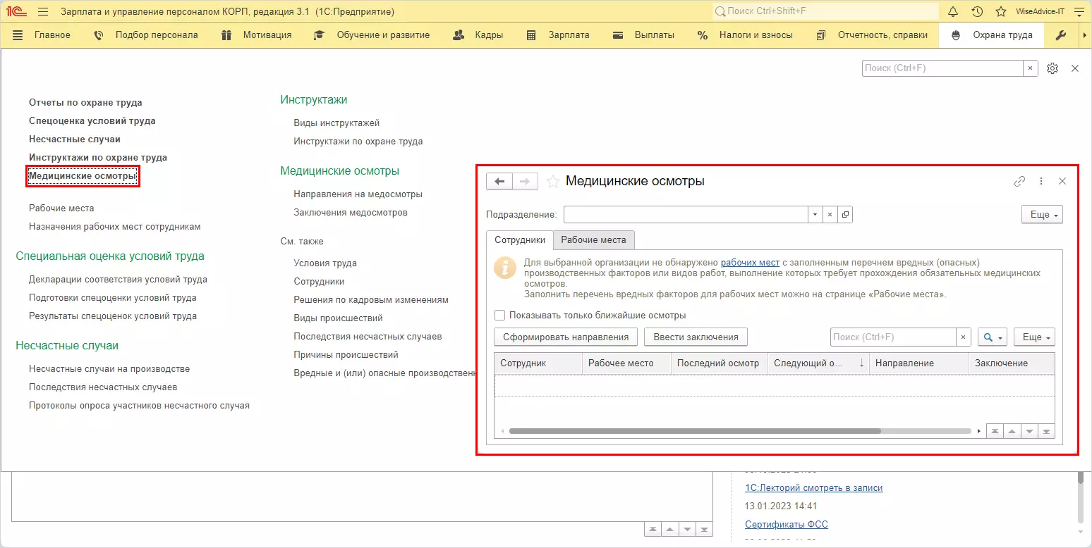 В результате настройки пользователю становится доступно рабочее место «Медицинские осмотры» в разделе Охрана труда.