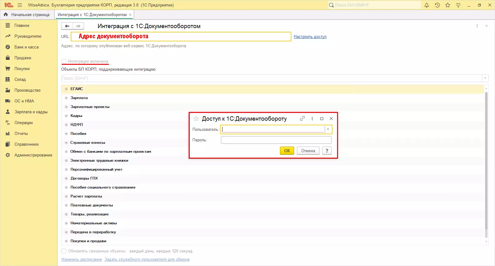 Настройка «Интеграция с 1С:Документооборотом» находится в разделе Администрирование. Подключив Документооборот в Бухгалтерии предприятия КОРП, авторизовавшись и выполнив настройку, пользователь может работать, не покидая привычного интерфейса 1С:Бухгалтерия.