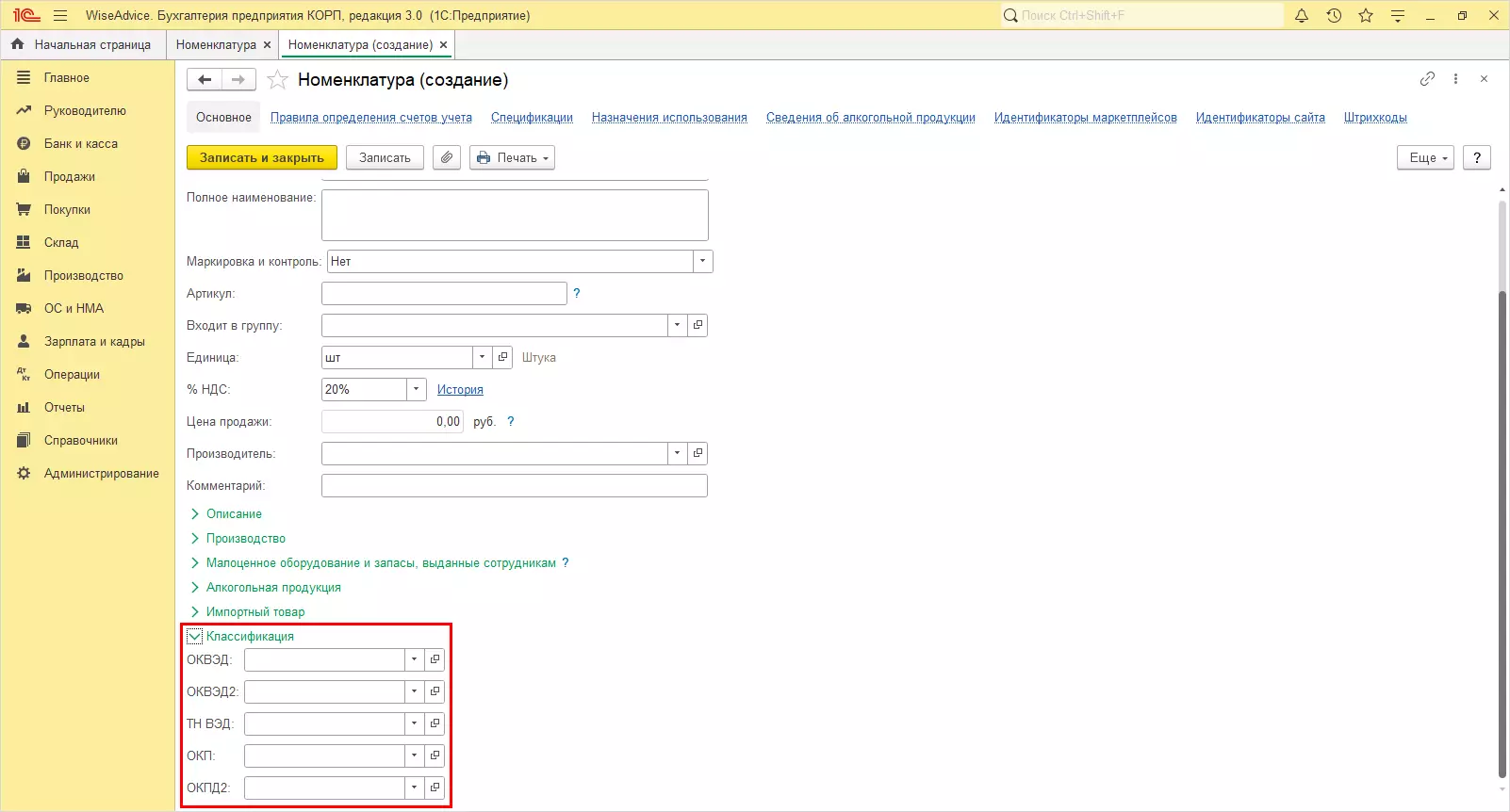 В карточках номенклатуры, ОС, НМА включается возможность указать ОКВЭД, ОКПД2, ТНВЭД – раздел Классификаторы – для заполнения уведомления.