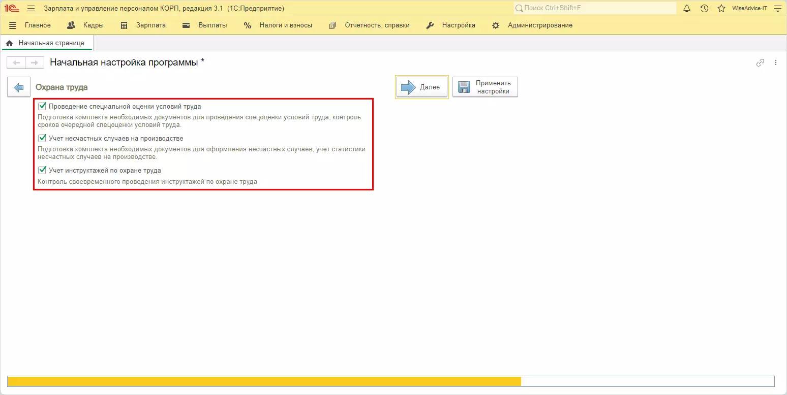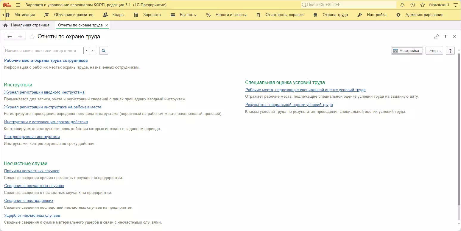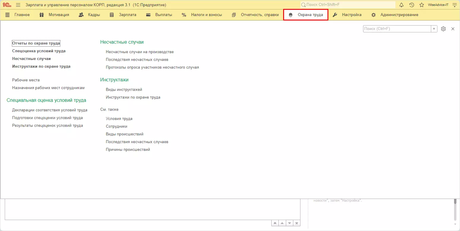Следующий этап настройки 1С:ЗУП КОРП Охрана труда также добавляет в меню специализированный раздел.