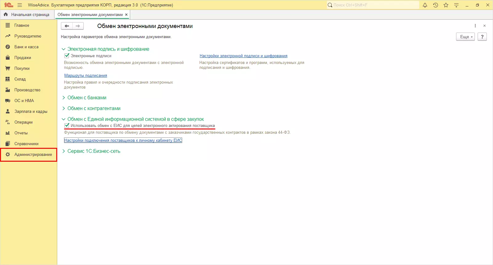 Работа в КОРП позволяет вести обмен с Единой информационной системой в сфере госзакупок. Для этого необходимо, зарегистрировавшись в системе ЕИС, настроить интеграцию с 1С:Бухгалтерия КОРП в разделе Администрирование - Обмен электронными документами - Обмен с ЕИС в сфере закупок.