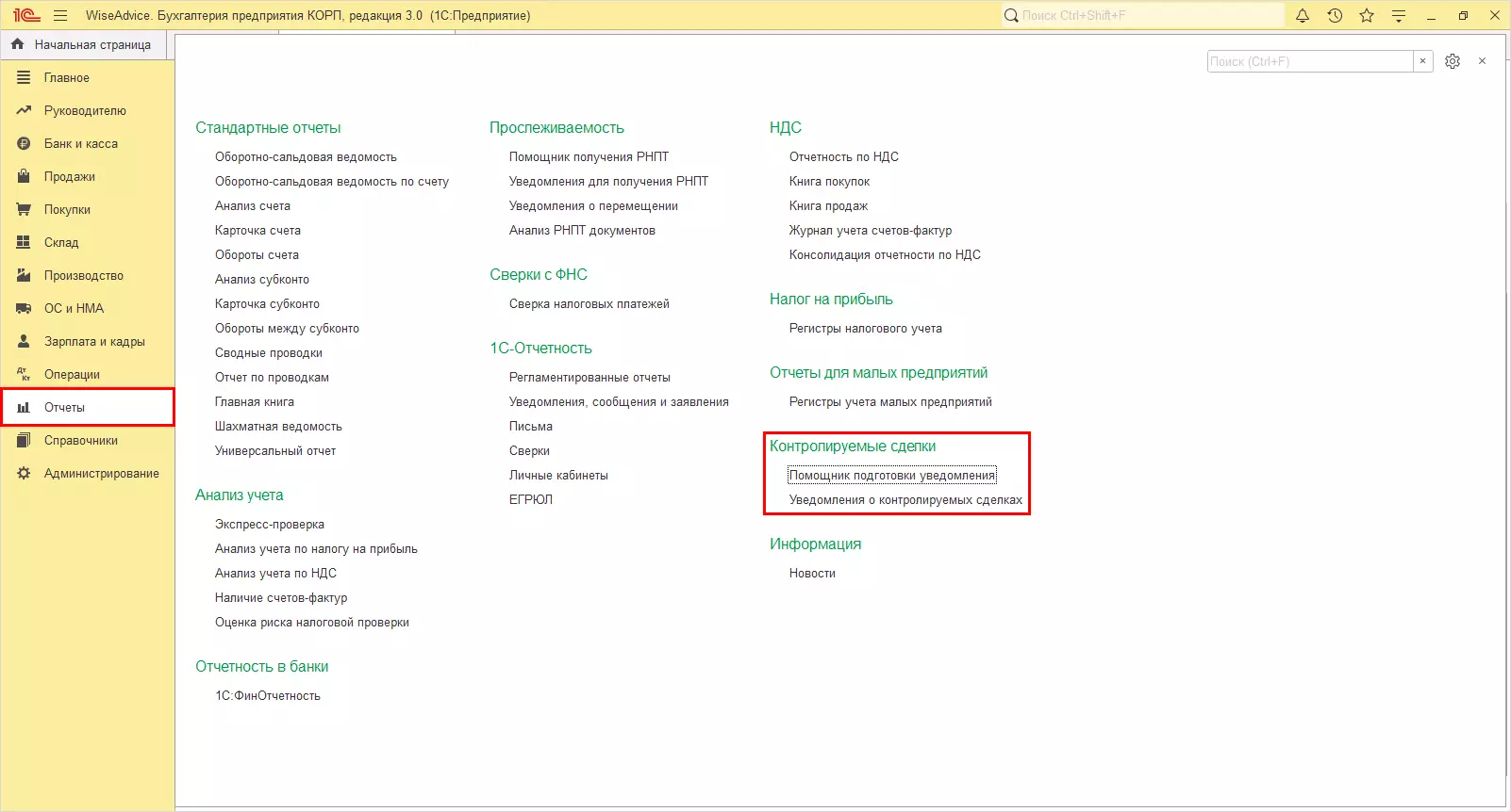 В разделе Отчеты есть возможность составить «Уведомление о контролируемых сделках» – блок «Контролируемые сделки».