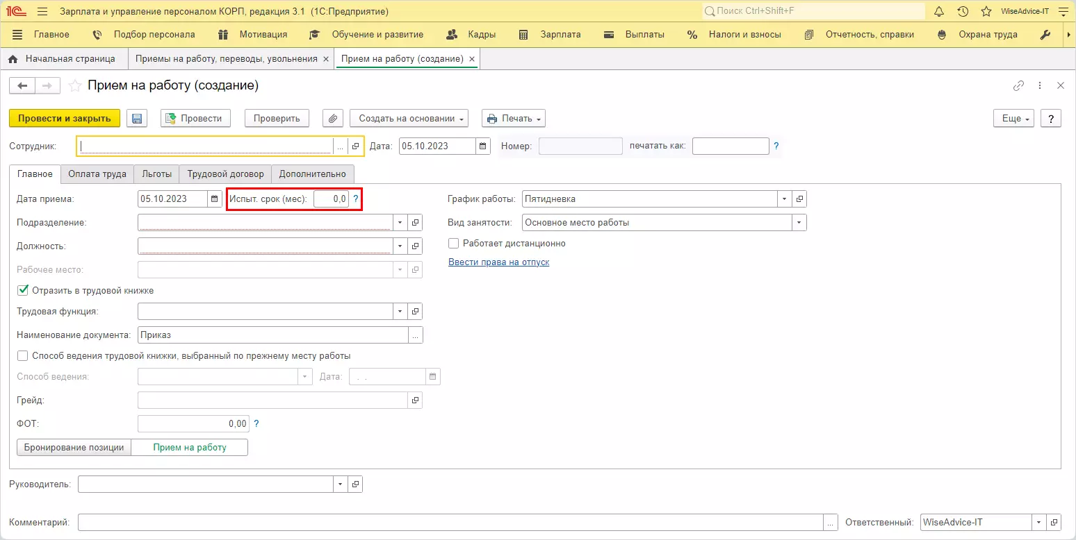 В приказе о приеме на работу предусмотрено поле «Испытательный срок». Это есть и в версии КОРП, и в версии ПРОФ.