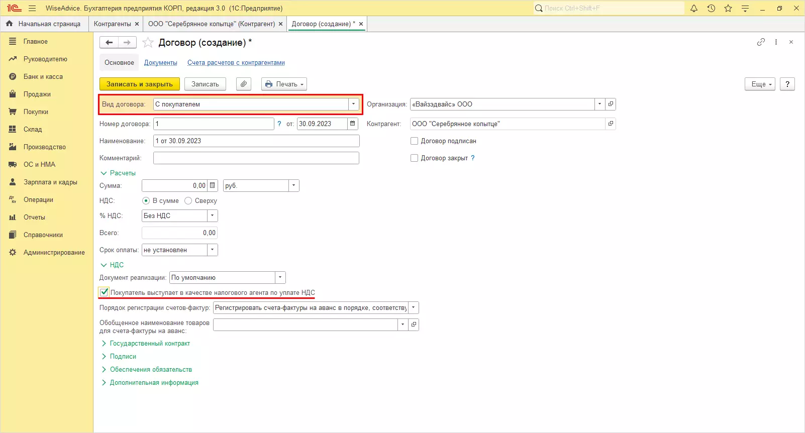 При заполнении договора с покупателем от лица фирмы-поставщика, так же в разделе «НДС» ставится отметка, что покупатель выступает в качестве налогового агента по уплате НДС.