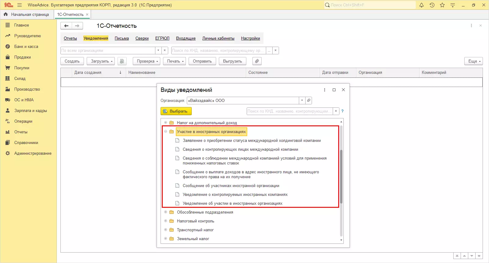 Версия 1С:Бухгалтерия КОРП в разделе 1С-Отчетность обеспечена функционалом «Участие в иностранных организациях». В этом разделе пользователь может заполнить и отправить уведомление о контролируемых иностранных компаниях (КИК), чего нет в версии ПРОФ.