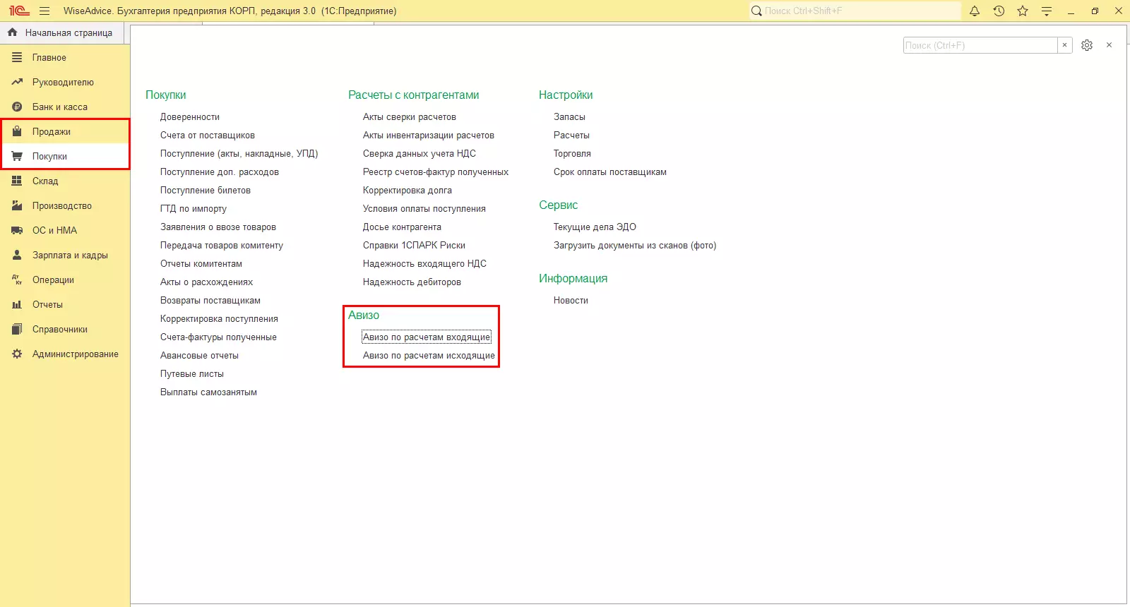 В разделах «Покупки» и «Продажи» также есть раздел «Авизо», включающий «Авизо по расчетам входящие» и «Авизо по расчетам исходящие».