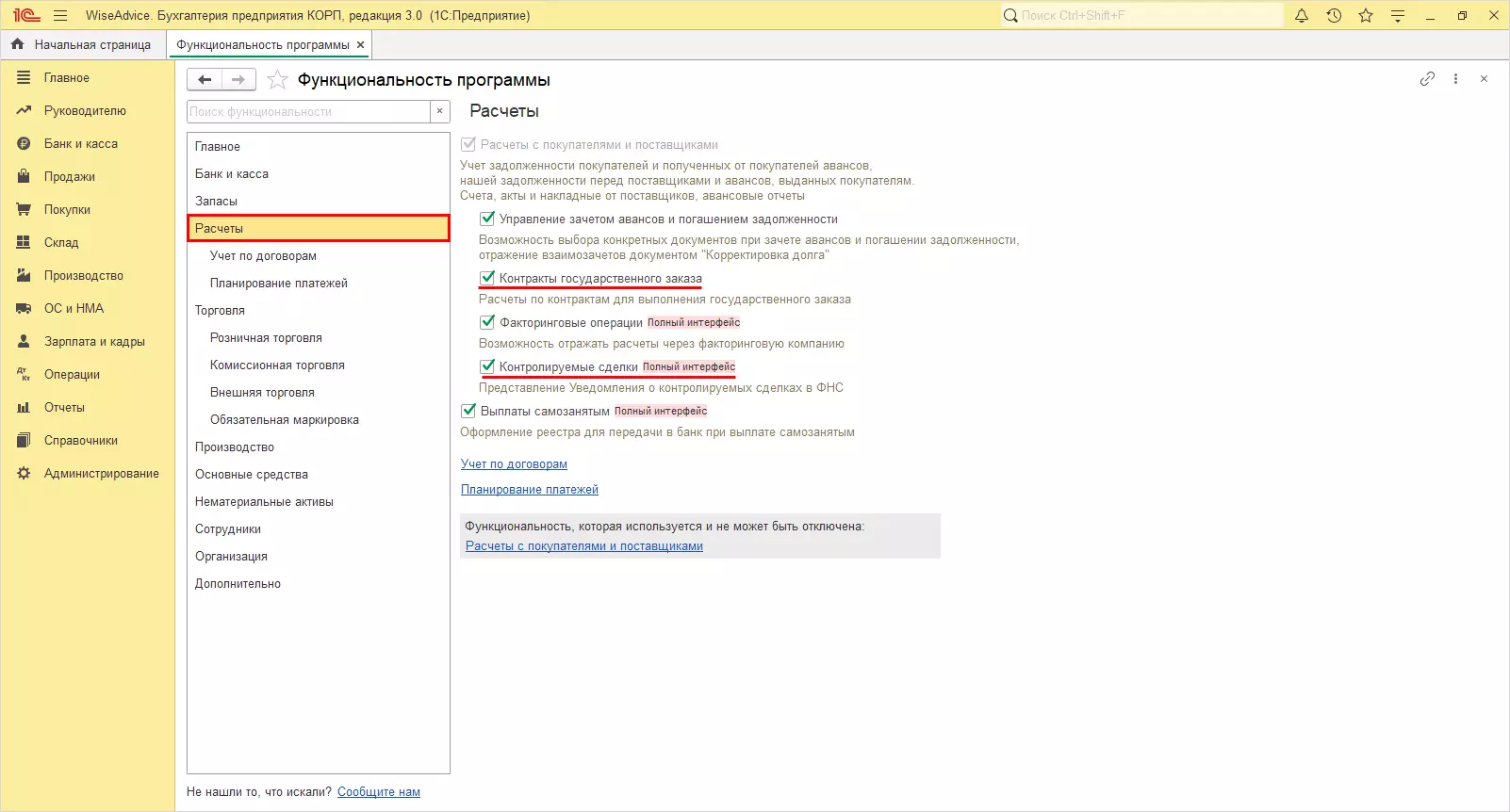 Установив галочку включения функциональности в разделе Расчеты - Контракты государственного заказа, система активирует одноименный функционал (госзаказ и гособоронзаказ). В этом же разделе включается функциональность «Контролируемые сделки». Их мы рассмотрим чуть ниже.