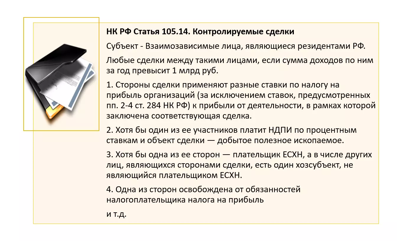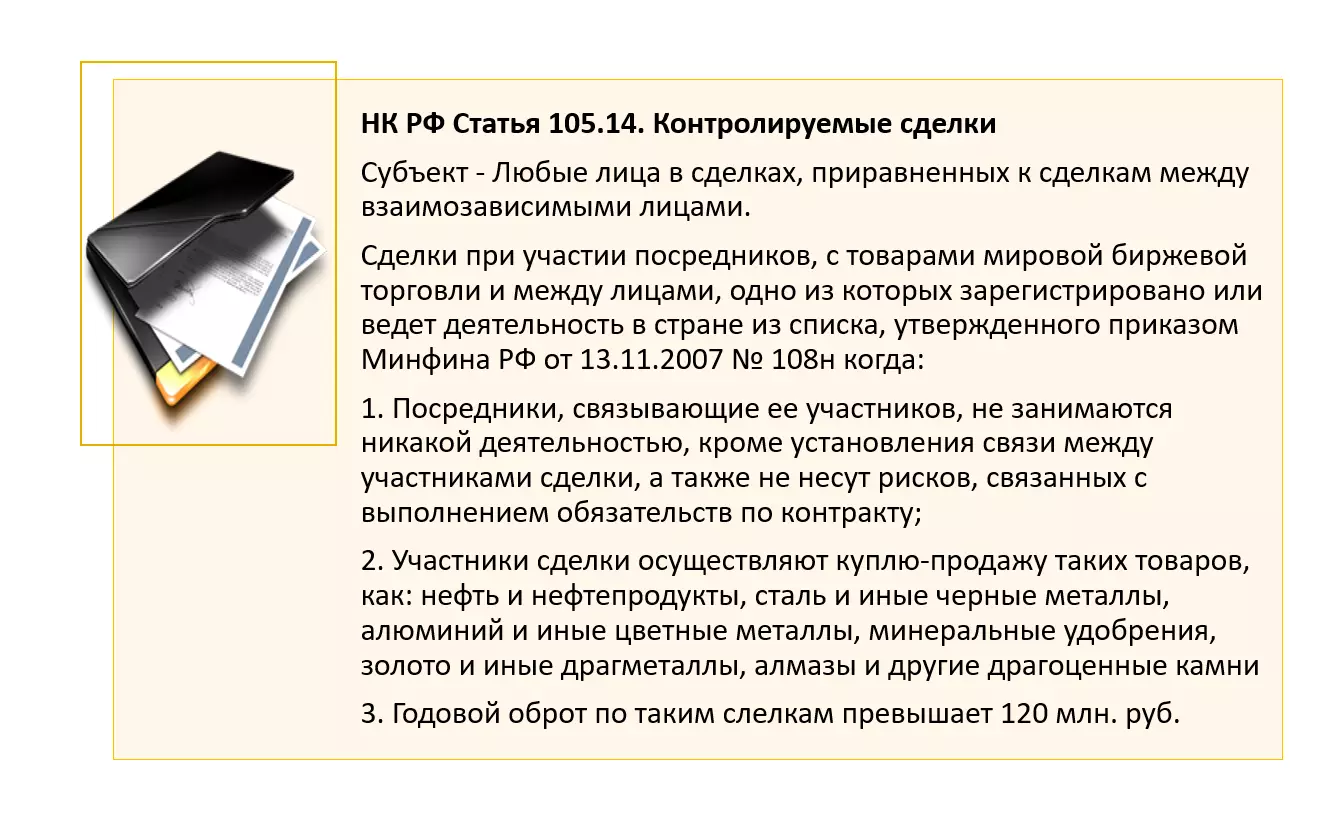 Условия признания сделки контролируемой представлены в ст. 105.14 НК РФ.
