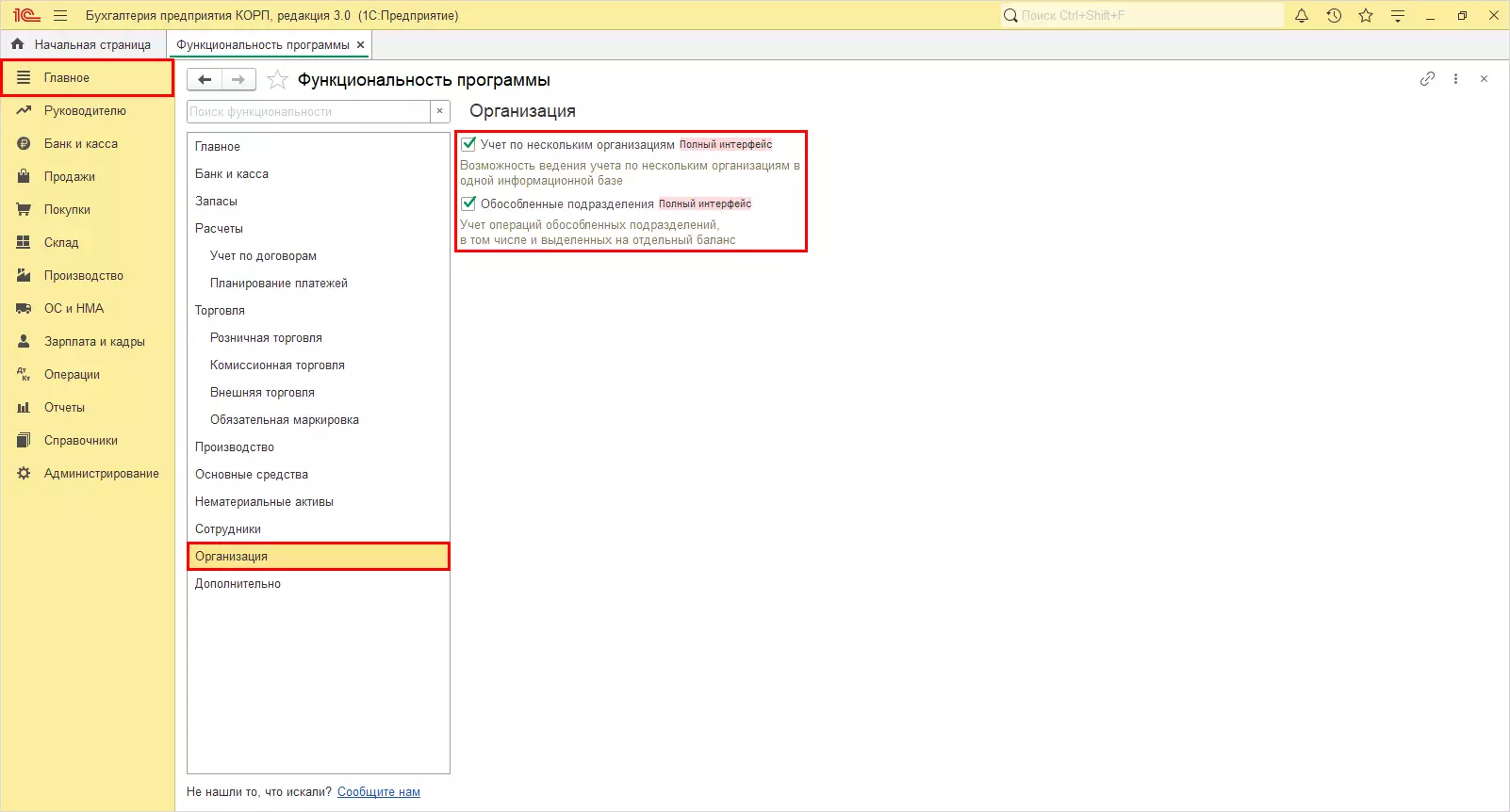 Но в зависимости от включенного дополнительного функционала, который есть только в корпоративной версии 1С:Бухгалтерия, пользователь увидит разницу.