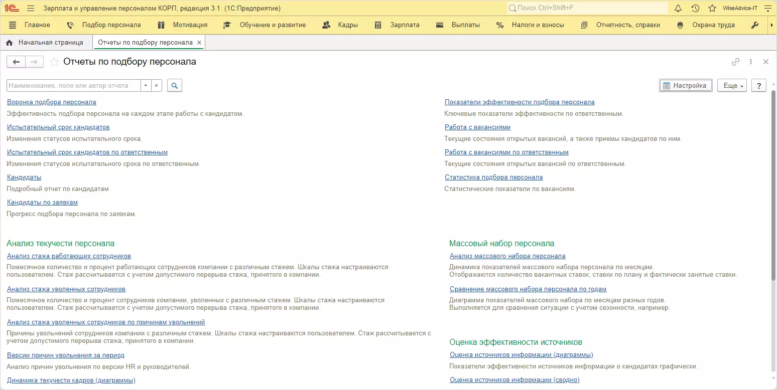 Раздел Отчеты по подбору персонала включает аналитические отчеты, позволяющие провести: