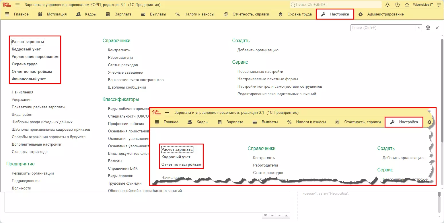 В отличие от 1С:ЗУП ПРОФ, версия КОРП помимо разделов настройки Расчет зарплаты и Кадровый учет имеет дополнительные пункты настроек разделов: