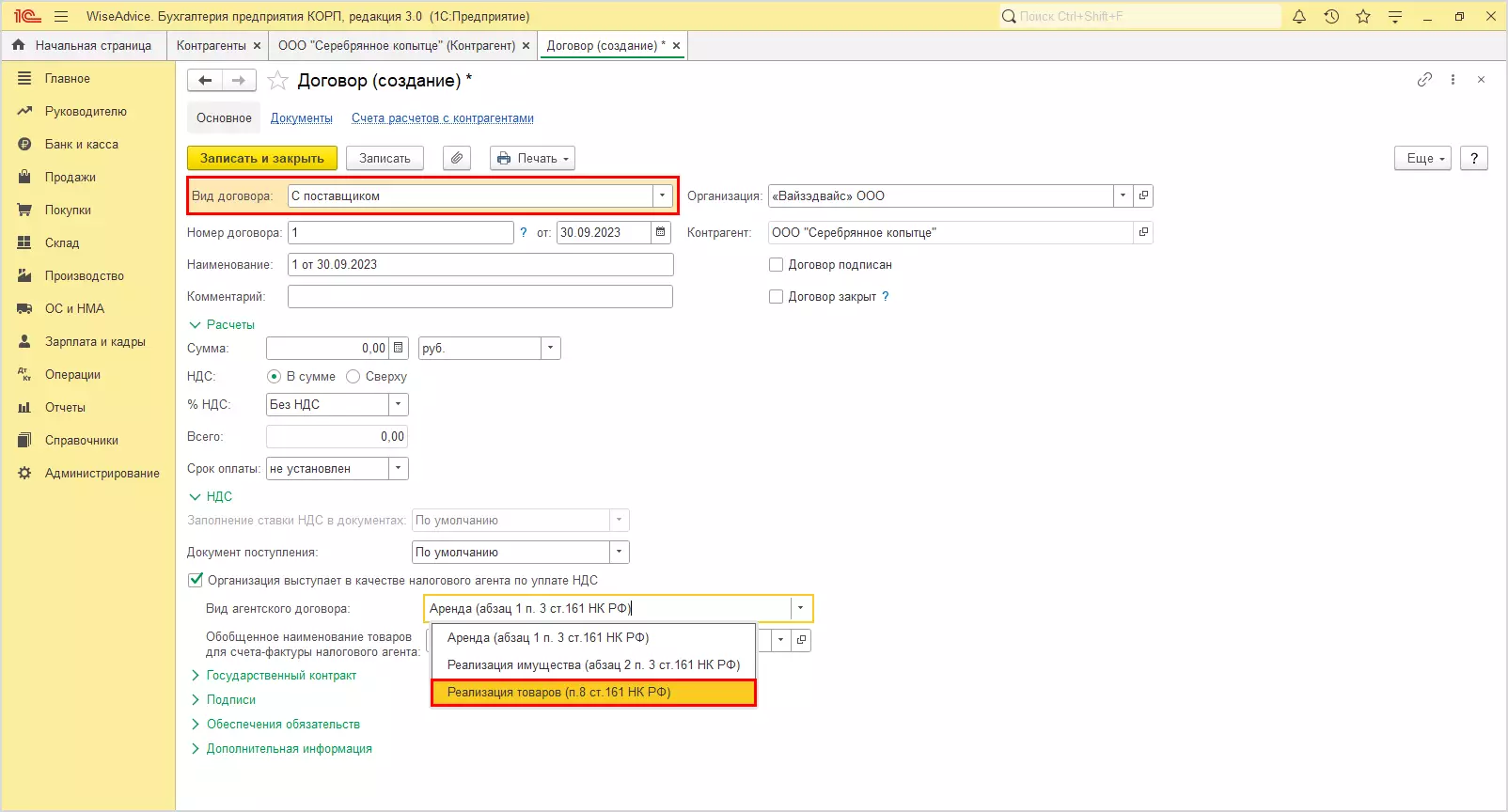 При заполнении договора с поставщиком компания-покупатель, исполняя обязанности налогового агента в карточке-договоре, в разделе «НДС» устанавливает галочку «Организация выступает в качестве налогового агента по уплате НДС» и указывает вид агентского договора «Реализация товаров».