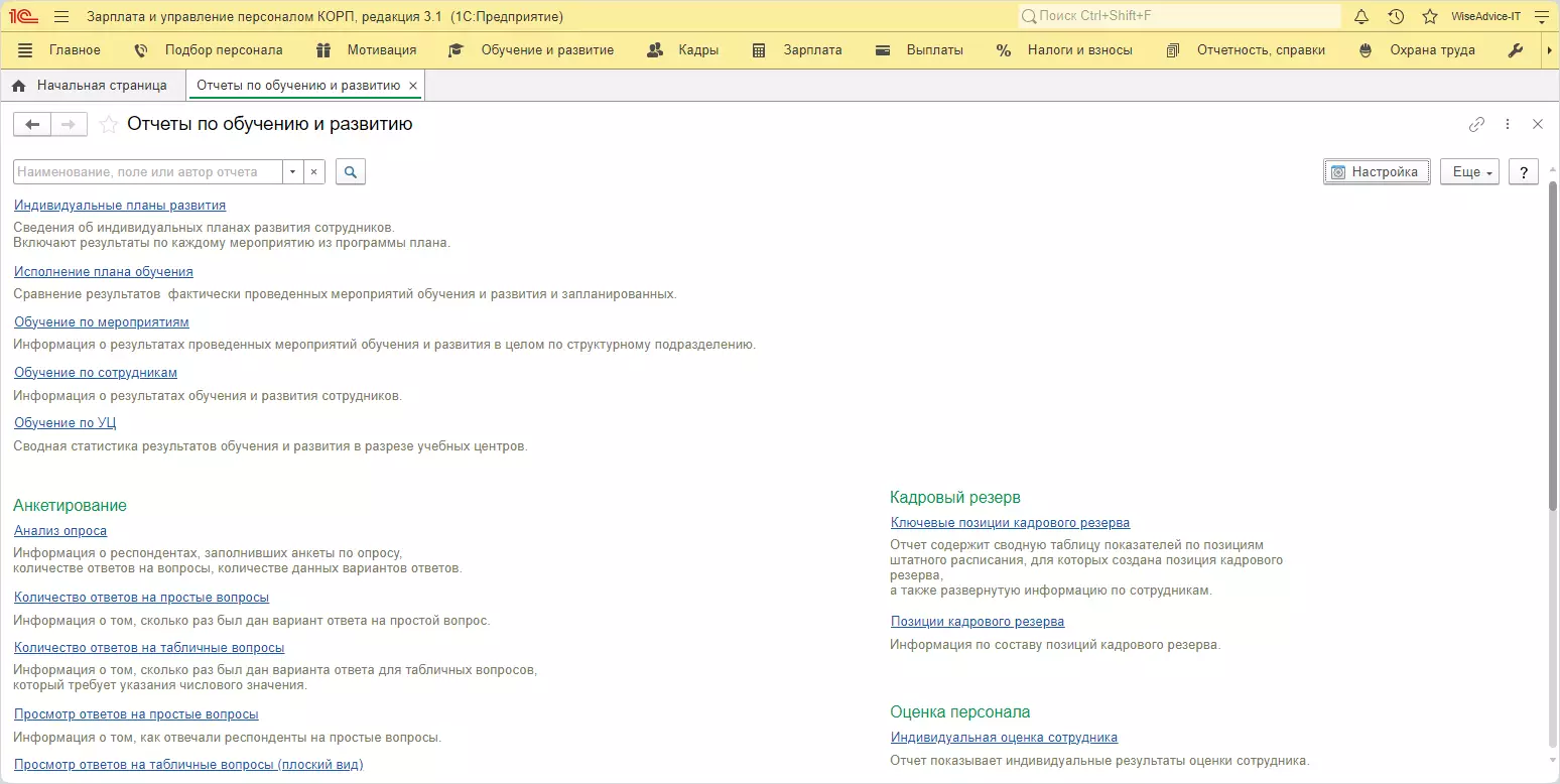 Блок отчетов раздела в версии КОРП включает множество отчетов по обучению и развитию, анкетированию и кадровому резерву.