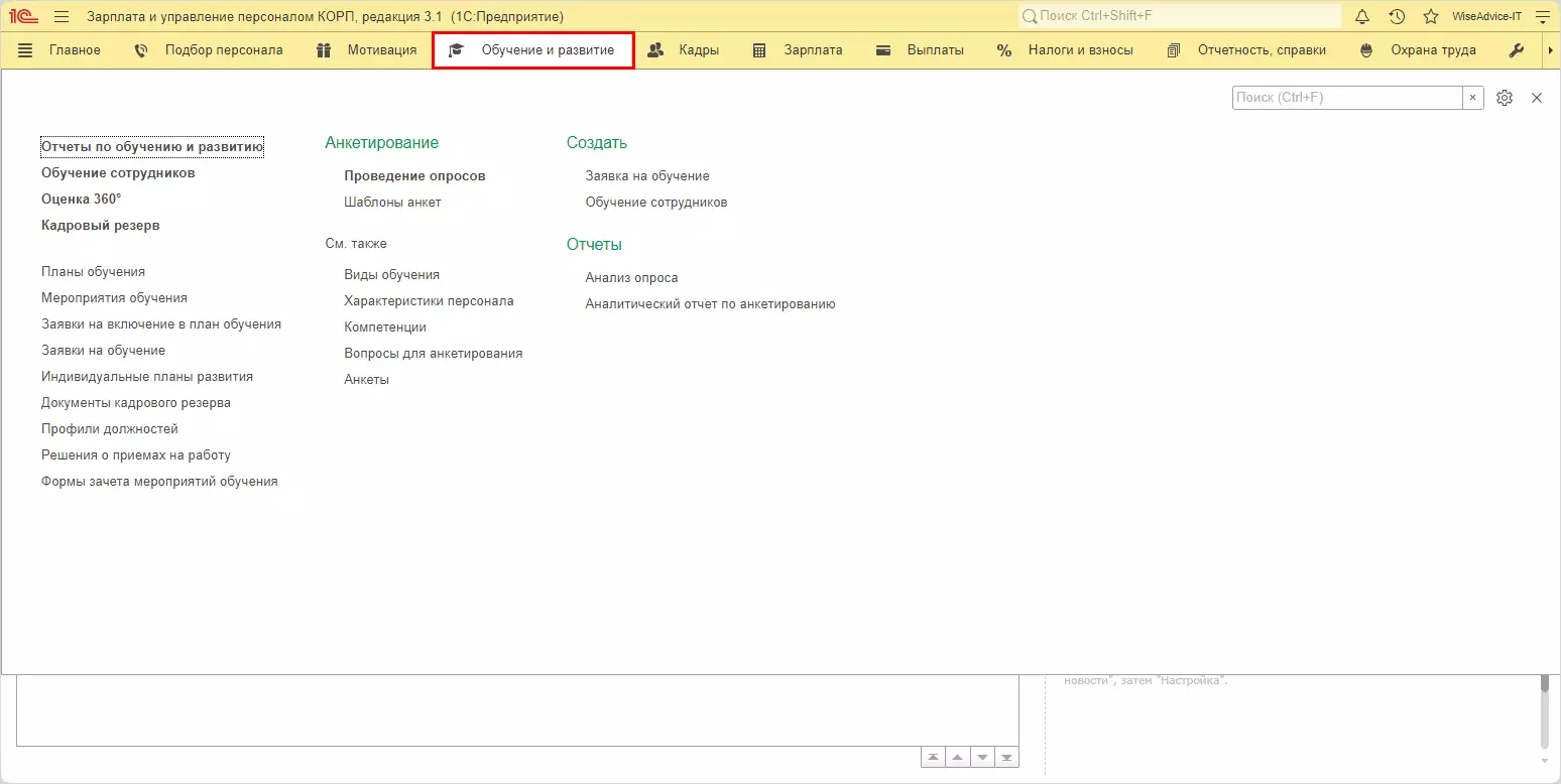 Включение настроек раздела «Развитие и обучение» включает дополнительный одноименный раздел меню.