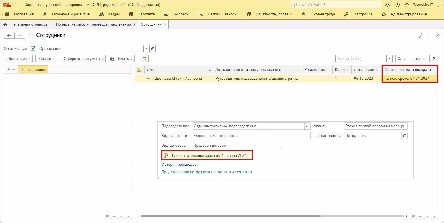 Но лишь в версии КОРП в справочнике Сотрудники далее из его карточки отражается информация о нахождении на испытательном сроке.
