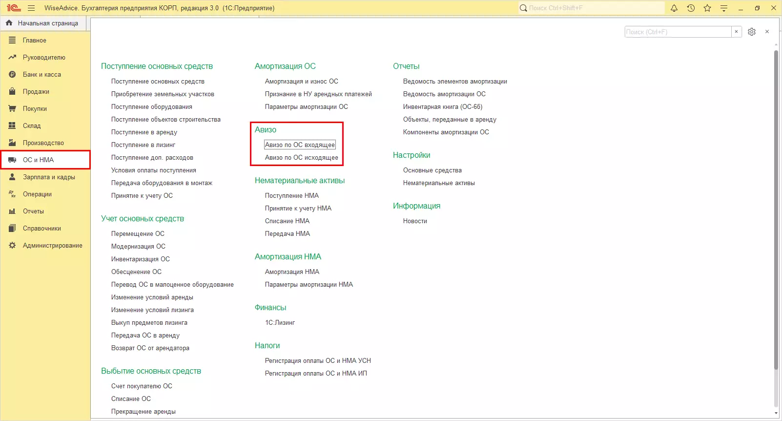 В разделе ОС и НМА - Авизо по ОС входящие и Авизо по ОС исходящие.