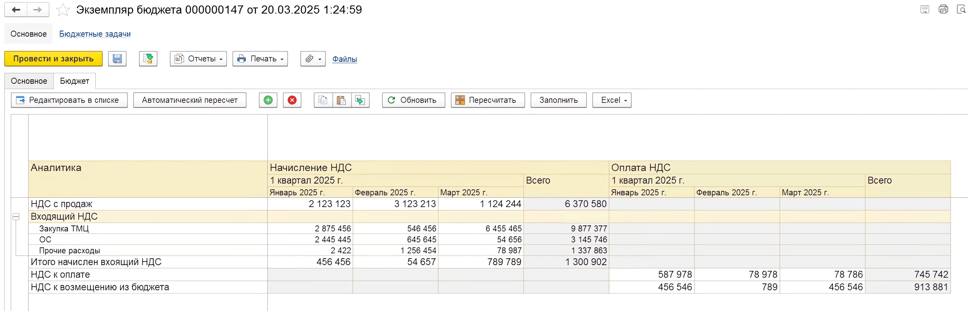 В 1С:ERP Управление предприятием НДС можно отобразить в виде бюджета, создав статьи бюджета, например, «НДС с продаж» и «НДС к оплате». Эти статьи можно включить в структуру бюджета в разделе операционной деятельности, чтобы учитывать их при планировании денежных потоков.