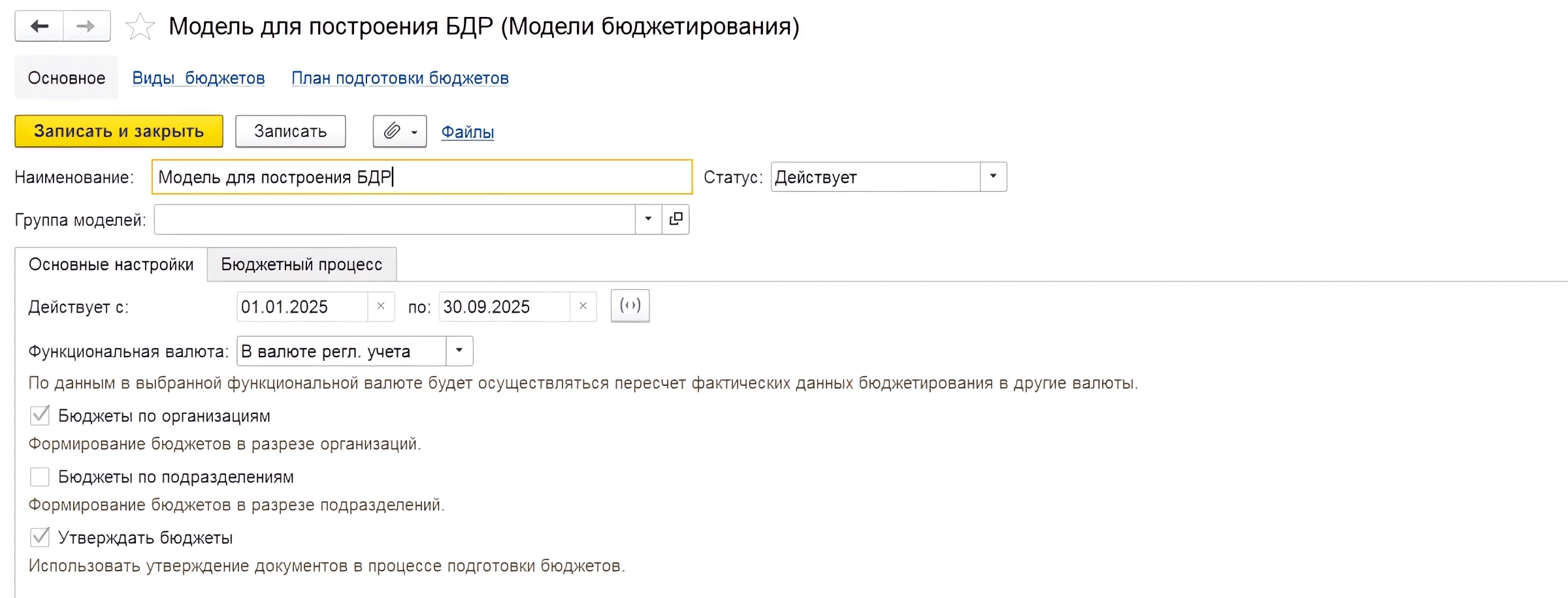 - Заполнить основные данные вида бюджета (модель бюджетирования, способ планирования и период).