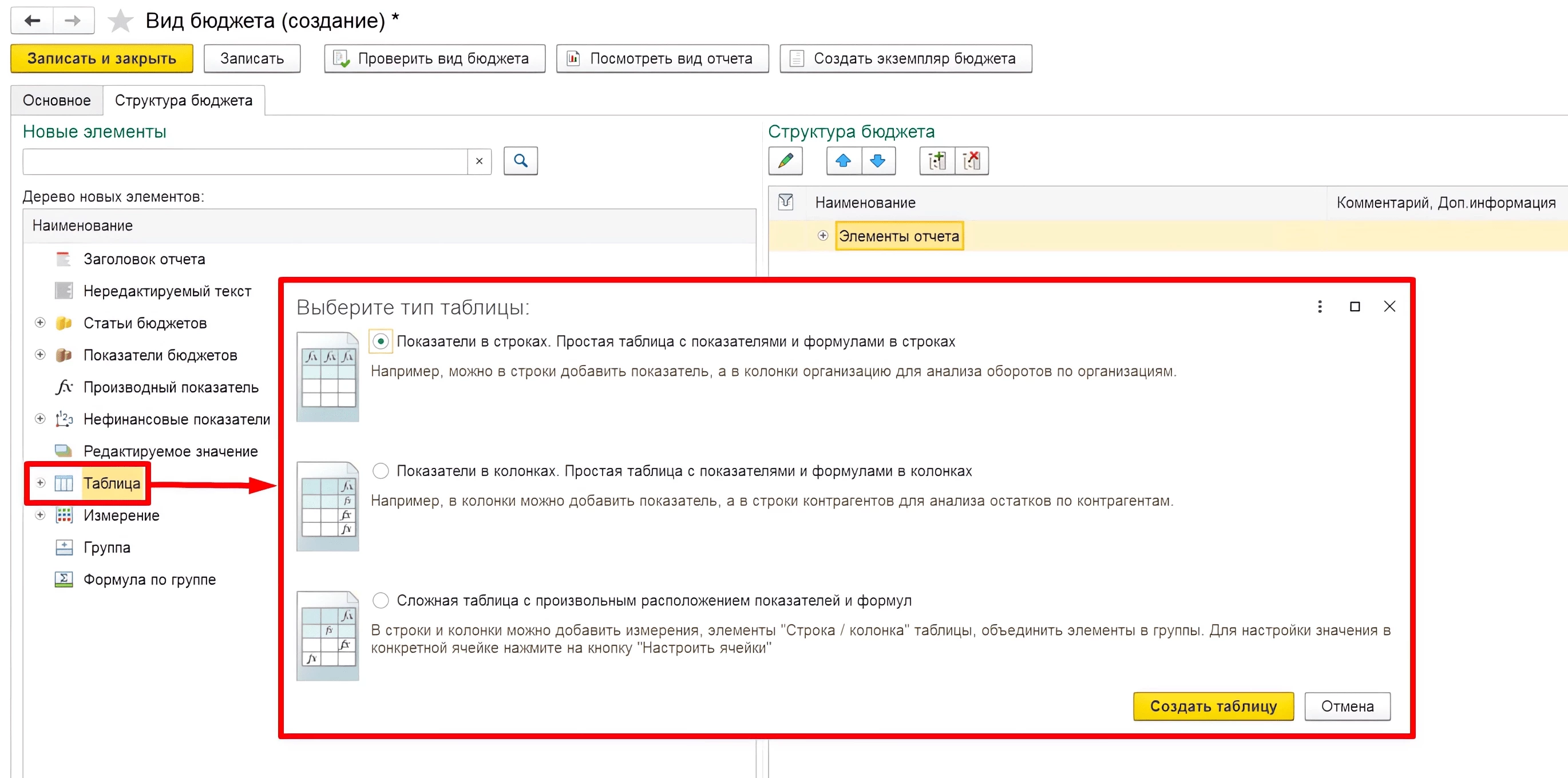 - Выберите тип таблицы для бюджета, а затем элементы заполните путем перетаскивания из левой части формы.