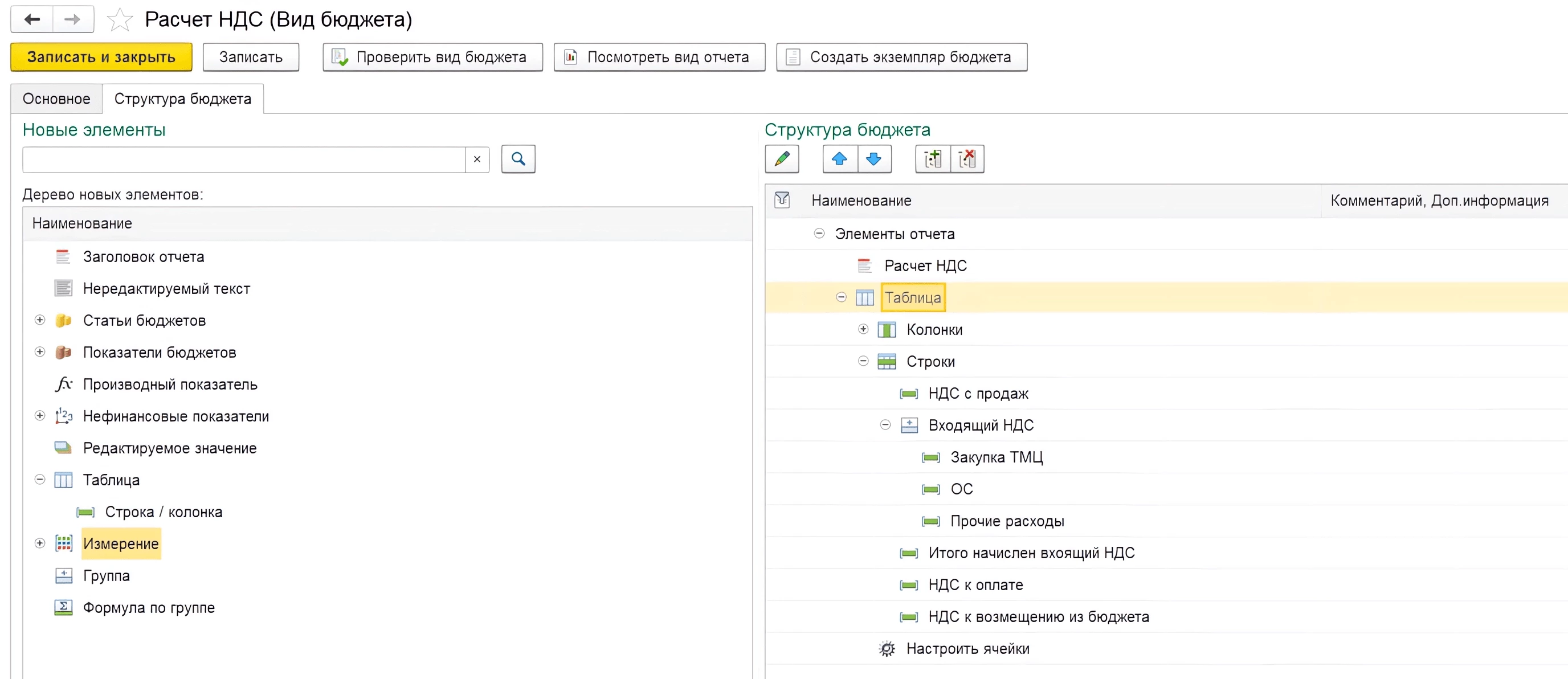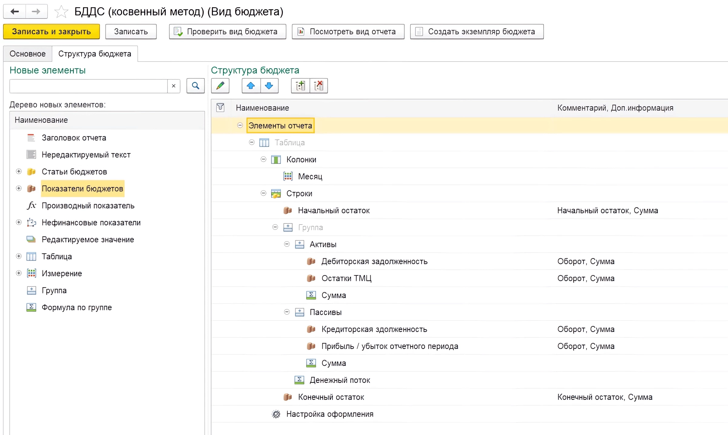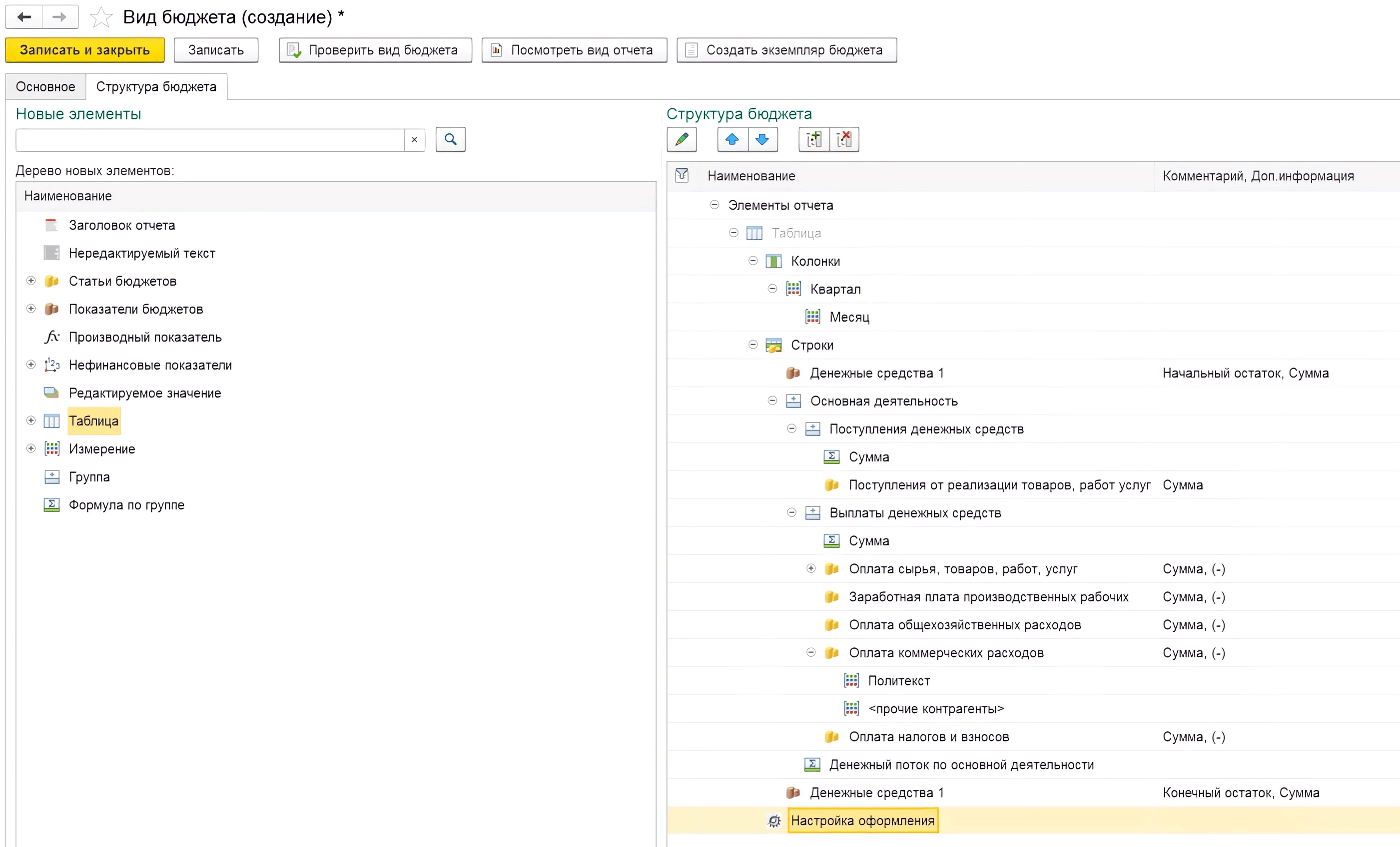- Сформировать структуру бюджета. Структура служит для визуализации данных по планируемым показателям. Ее настройка осуществляется на отдельной вкладке вида бюджета с использованием интуитивно понятного конструктора: