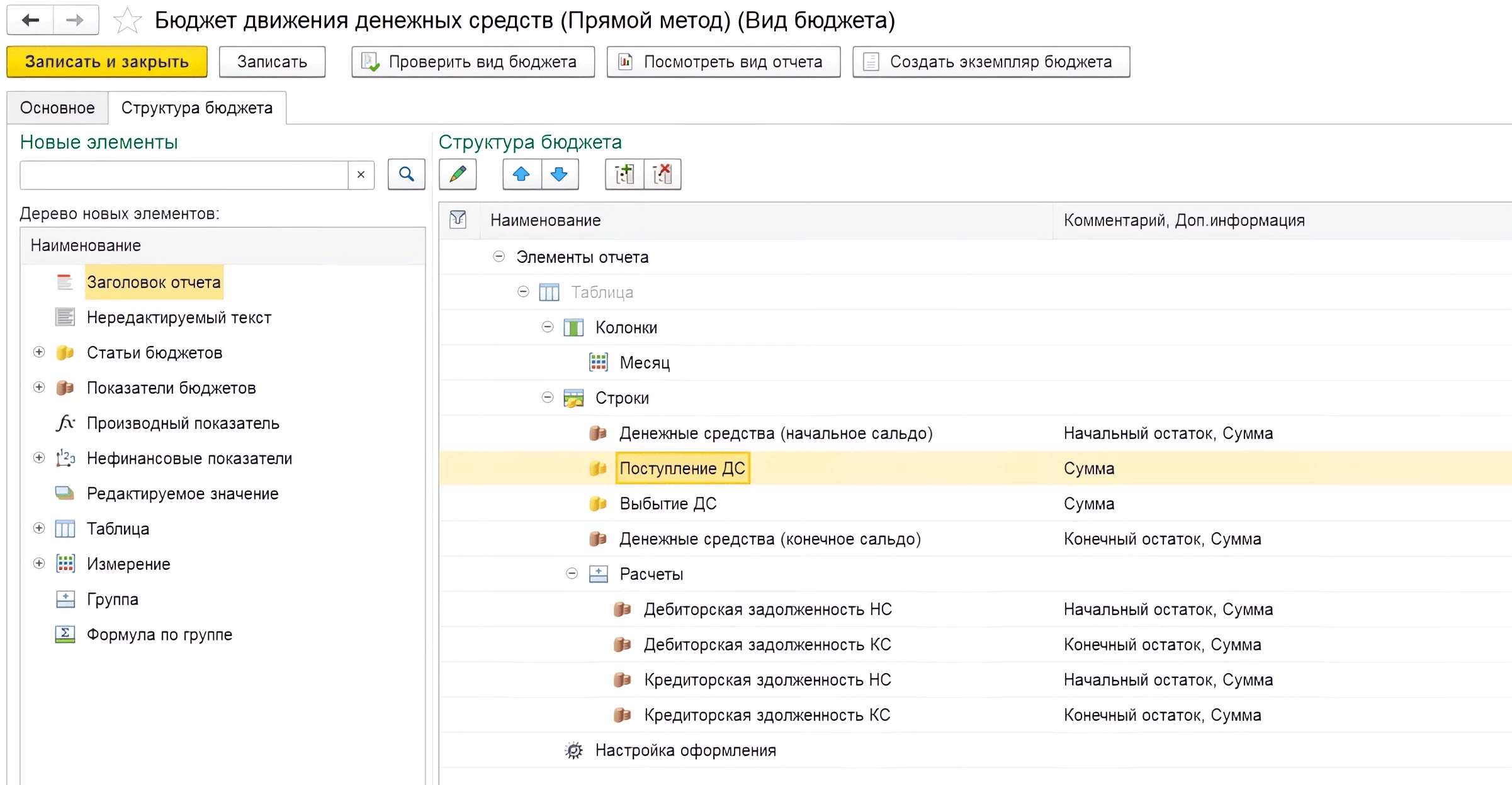 - Создайте новый элемент, например, «Бюджет движения денежных средств».