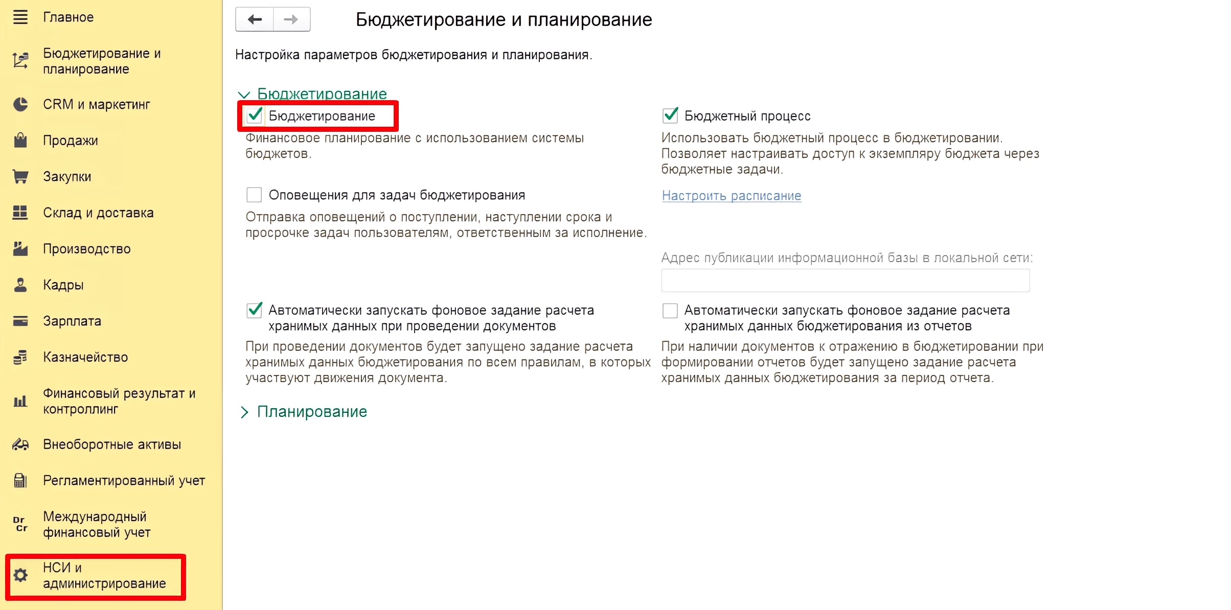 Перейти в раздел НСИ и Администрирование — Настройка НСИ и разделов — Бюджетирование и планирование. Установить флаг напротив опции «Бюджетирование».