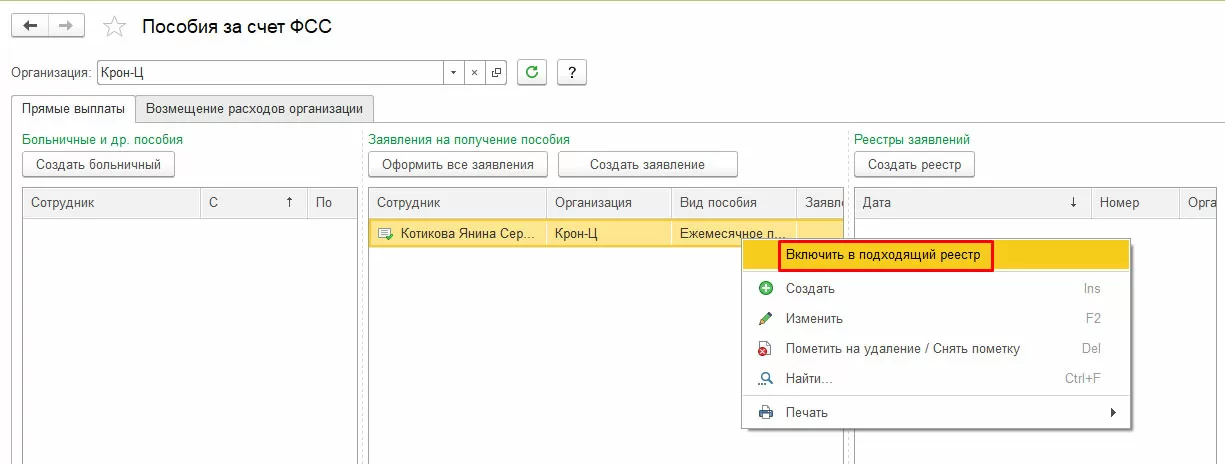 Для получения файла выгрузки и подачи его в ФСС создадим реестр, куда попадают заявления работников.