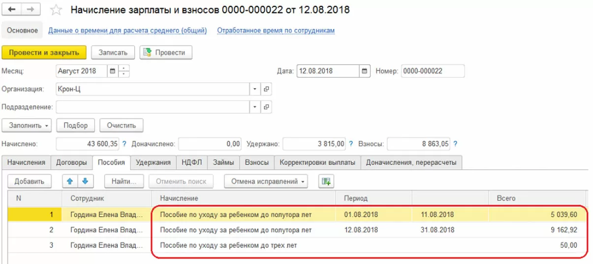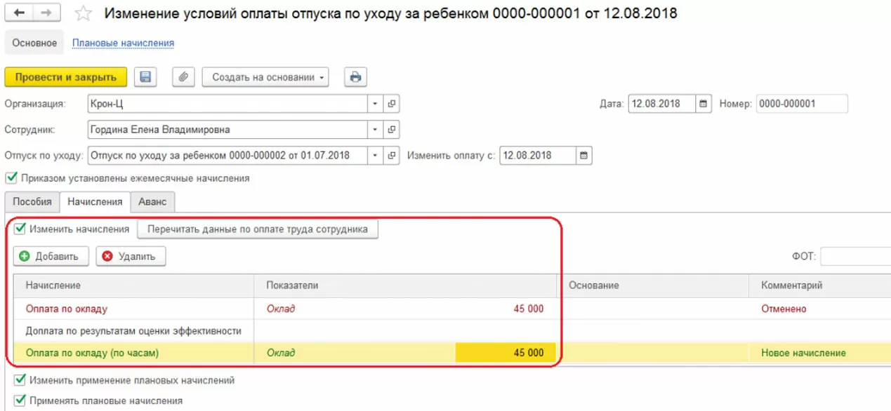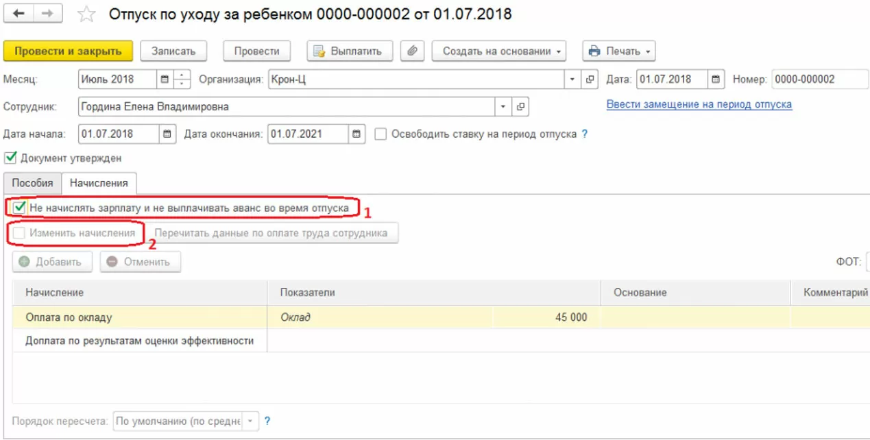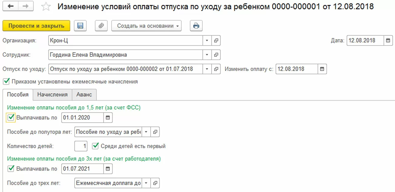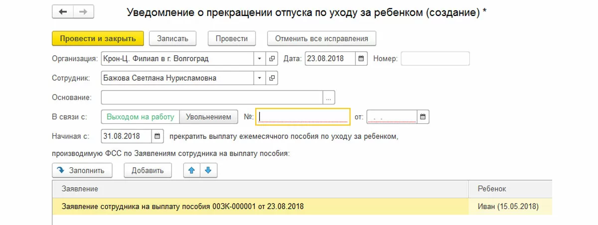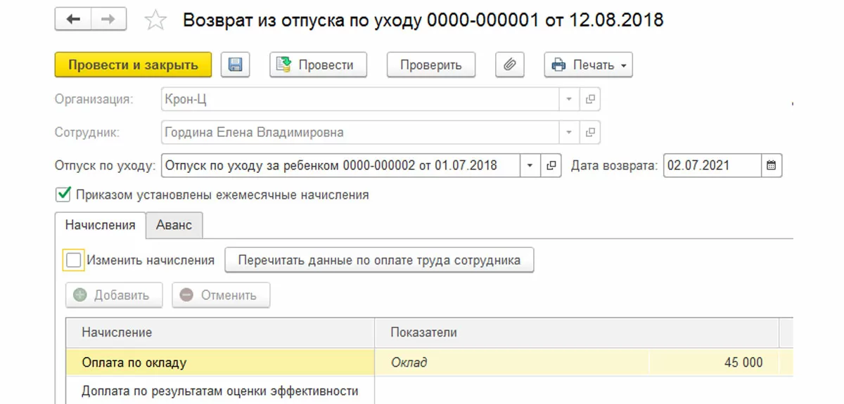 Документ «Возврат из отпуска по уходу за ребенком» останавливает все пособия, введенные первоначальным документом, и возвращает основные начисления сотрудника.