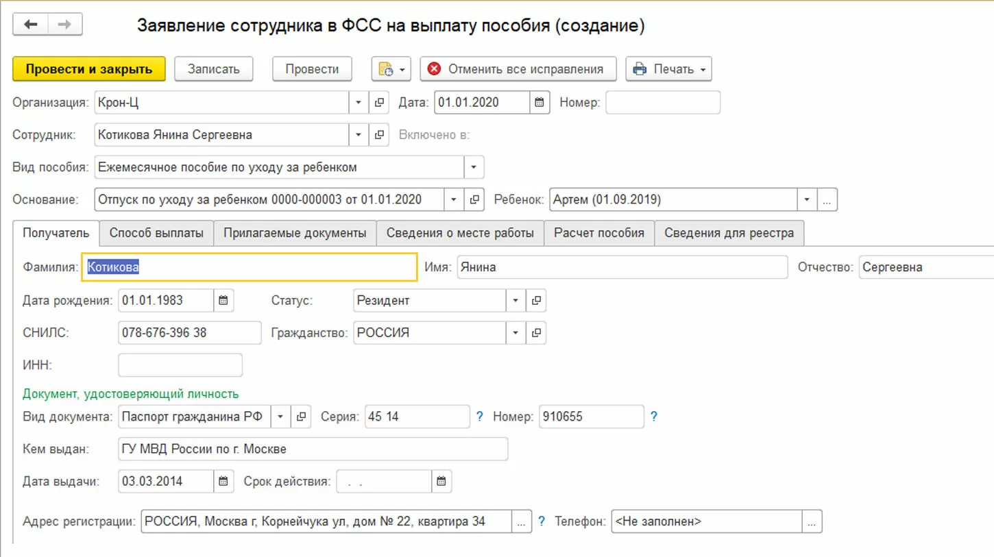 В отчетности 4-ФСС и РСВ данные о пособии не отражаются, так как сумма уплаты страховых взносов не уменьшается на сумму расходов по ним. Сам «Отпуск» заносится как по основному месту работы, так и по совместительству, поэтому поле «Сотрудник» представлено физическим лицом.