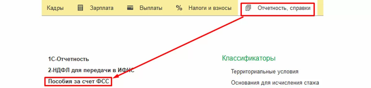 Далее нужно перейти в меню «Отчетность, справки-Пособия за счет ФСС».