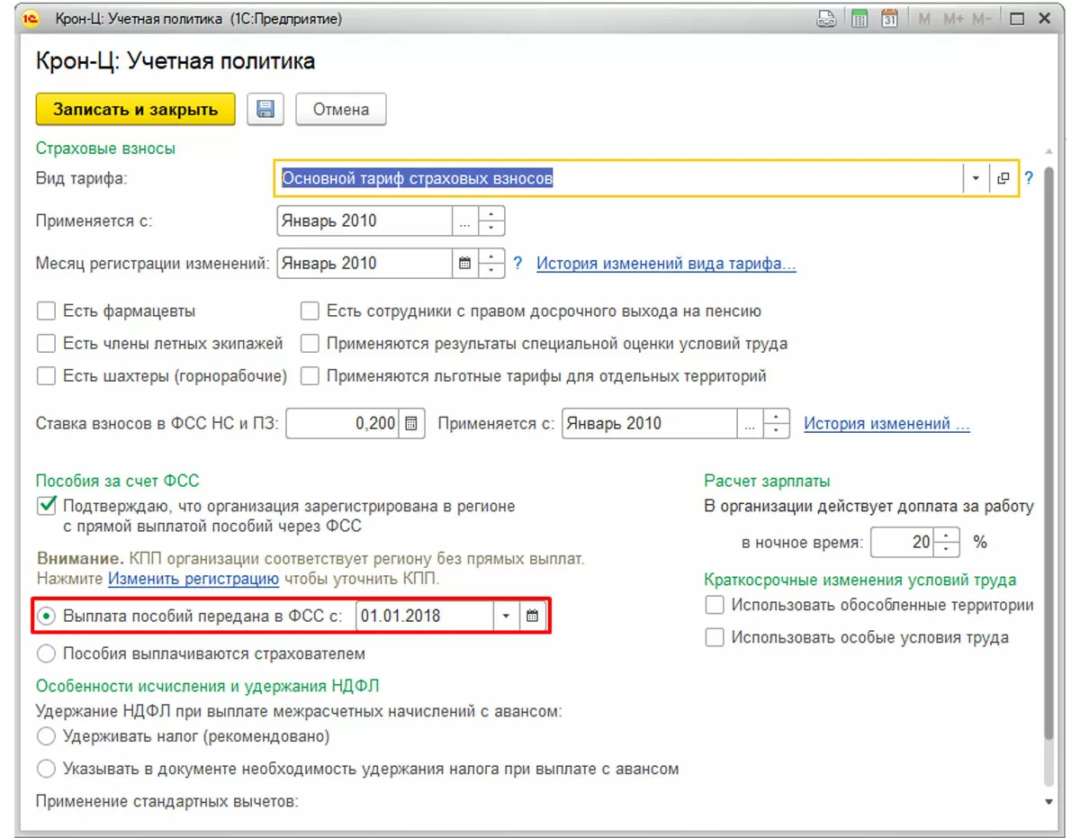 Рассмотрим возможность учета пособий в 1С:Предприятие организациями, передавшими полномочия по их выплате в территориальный ФСС РФ. Начиная с версии 1С ЗУП 3.1.5, в настройке карточки организации можно и нужно указывать дату действия передачи выплаты пособий, т.к. организация в любое время может «переехать» в регион с пилотным проектом, поэтому должна быть возможность указать любую дату вступления в проект.
